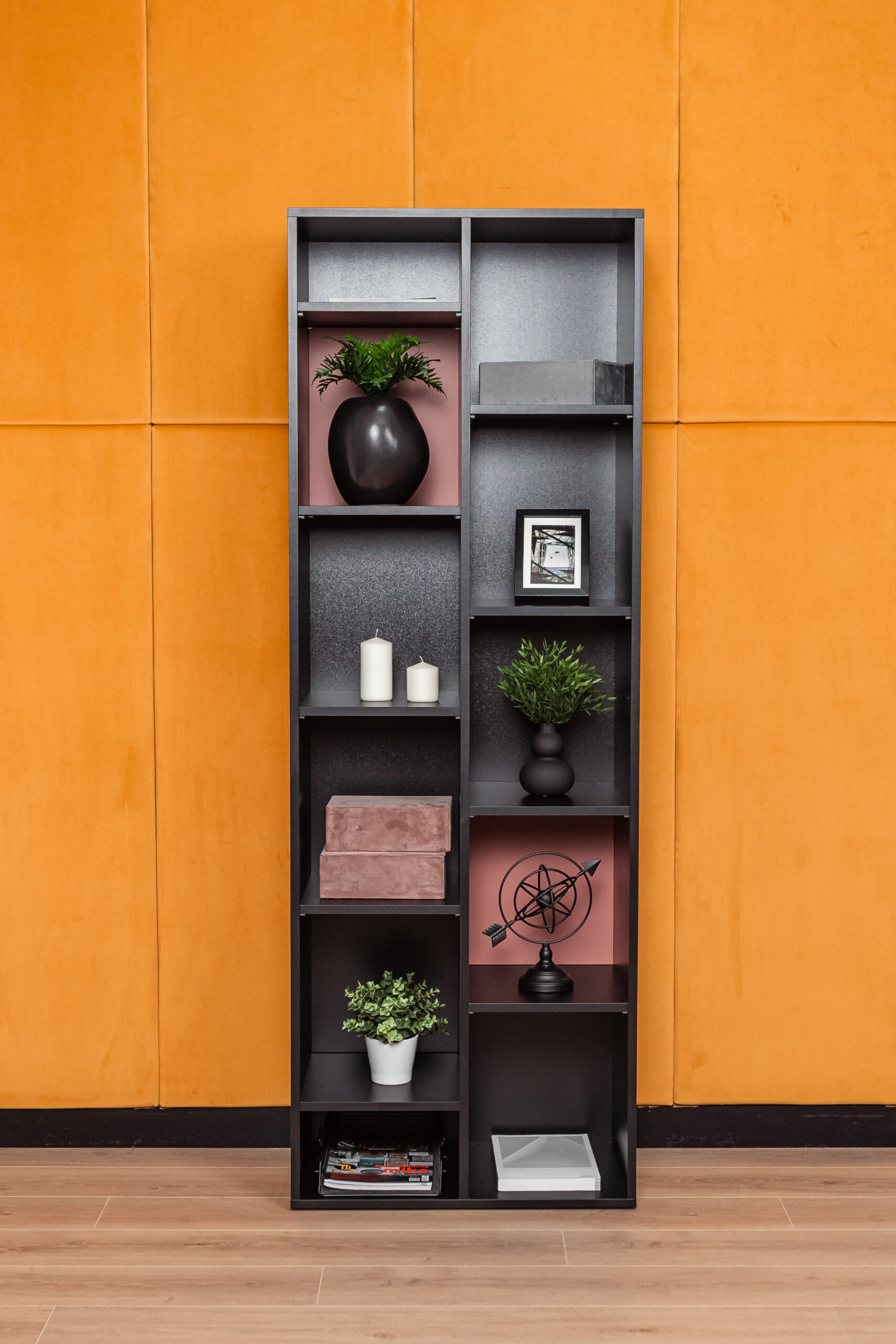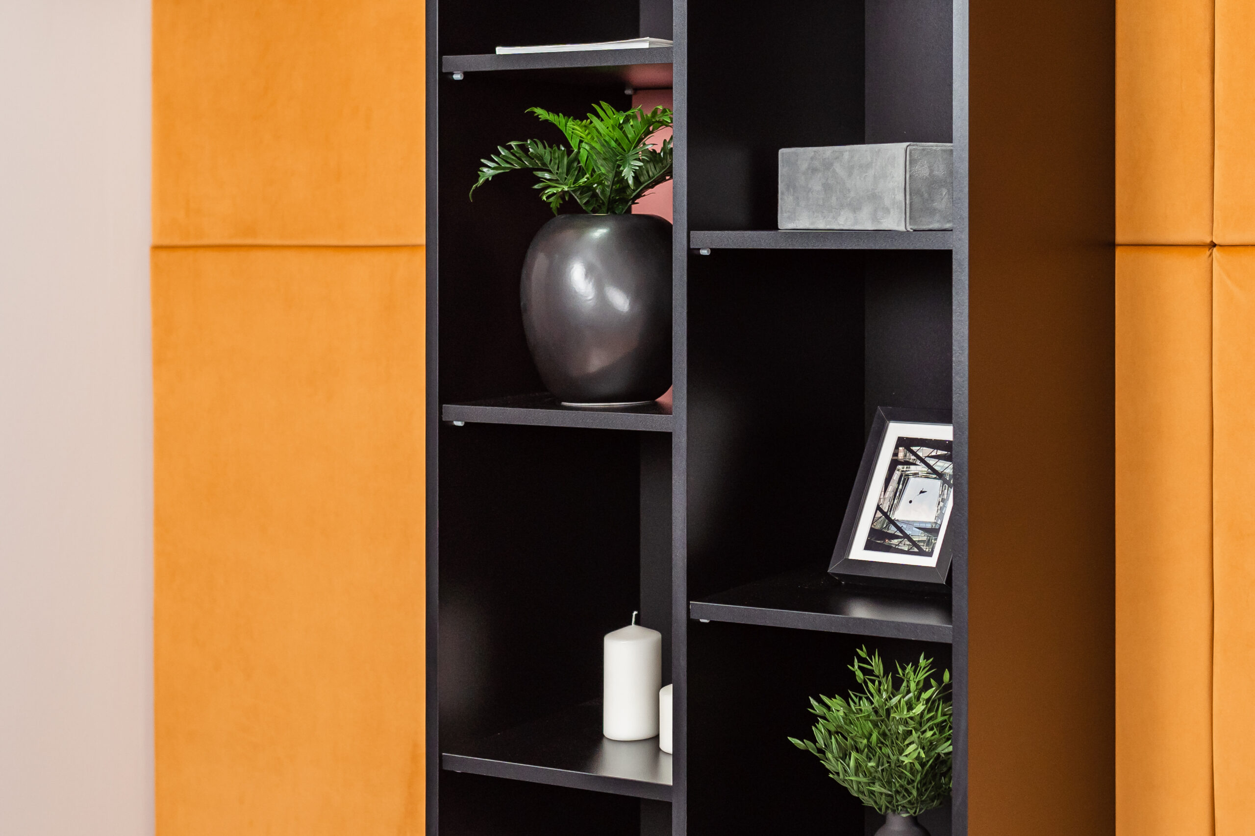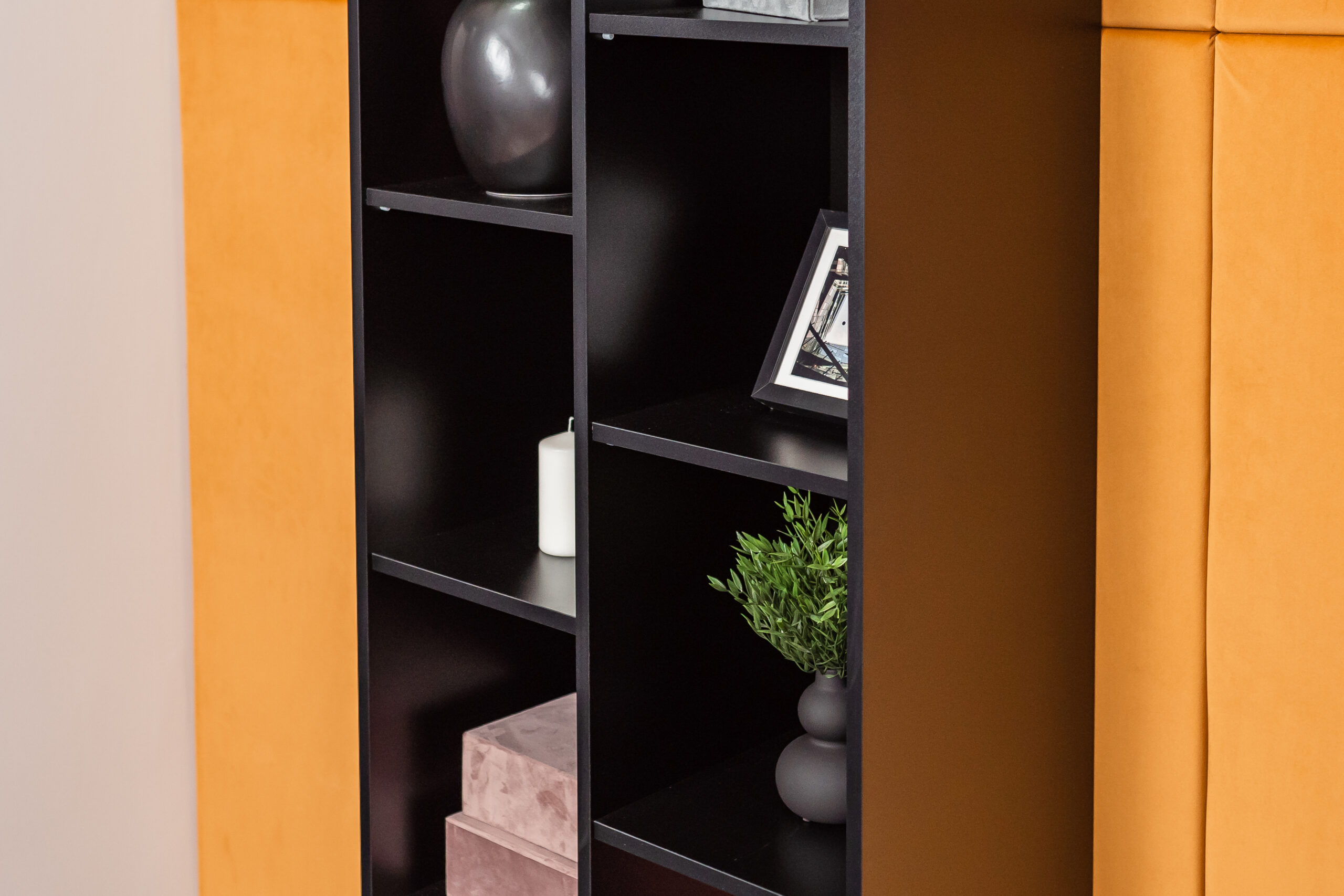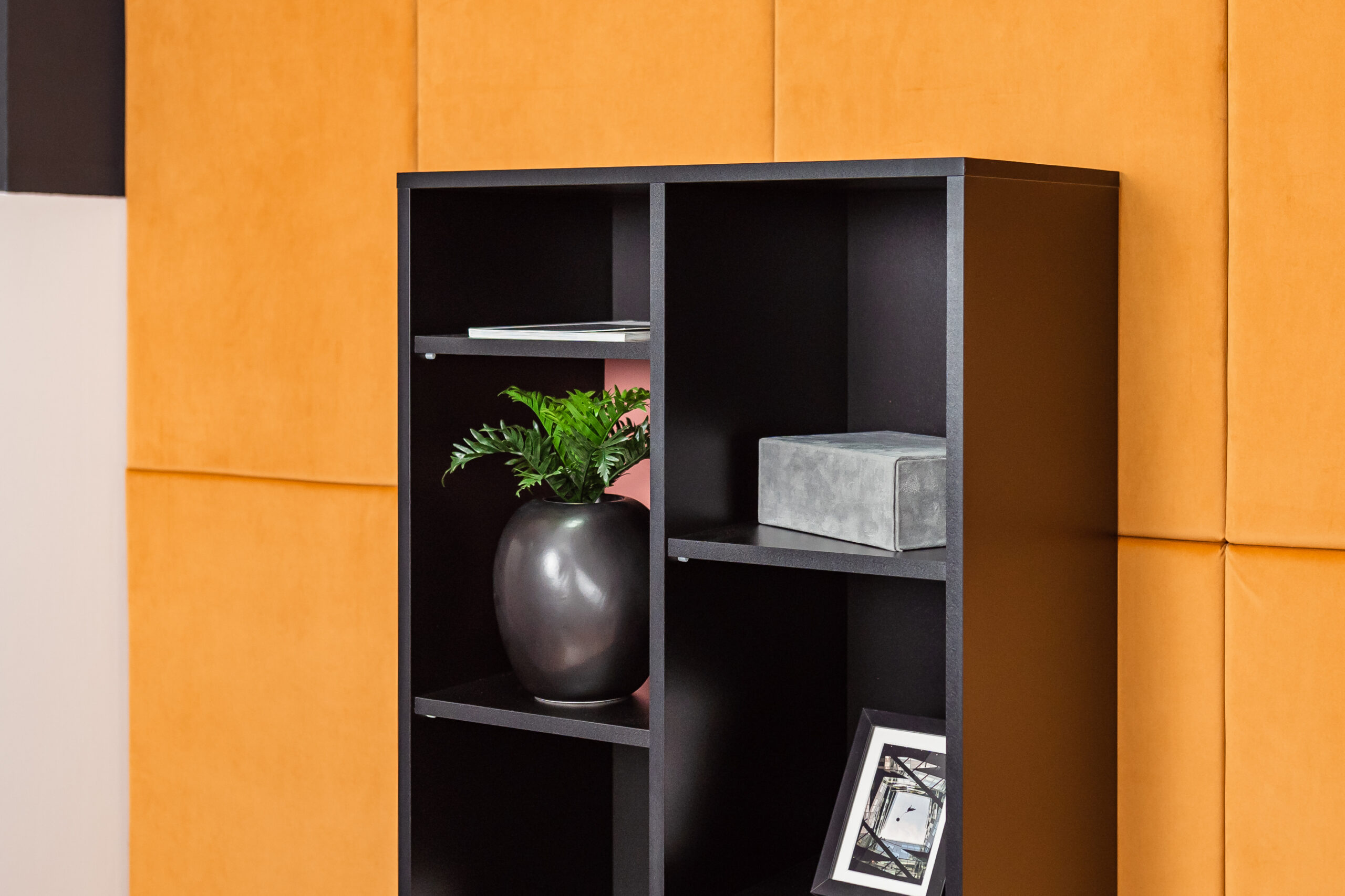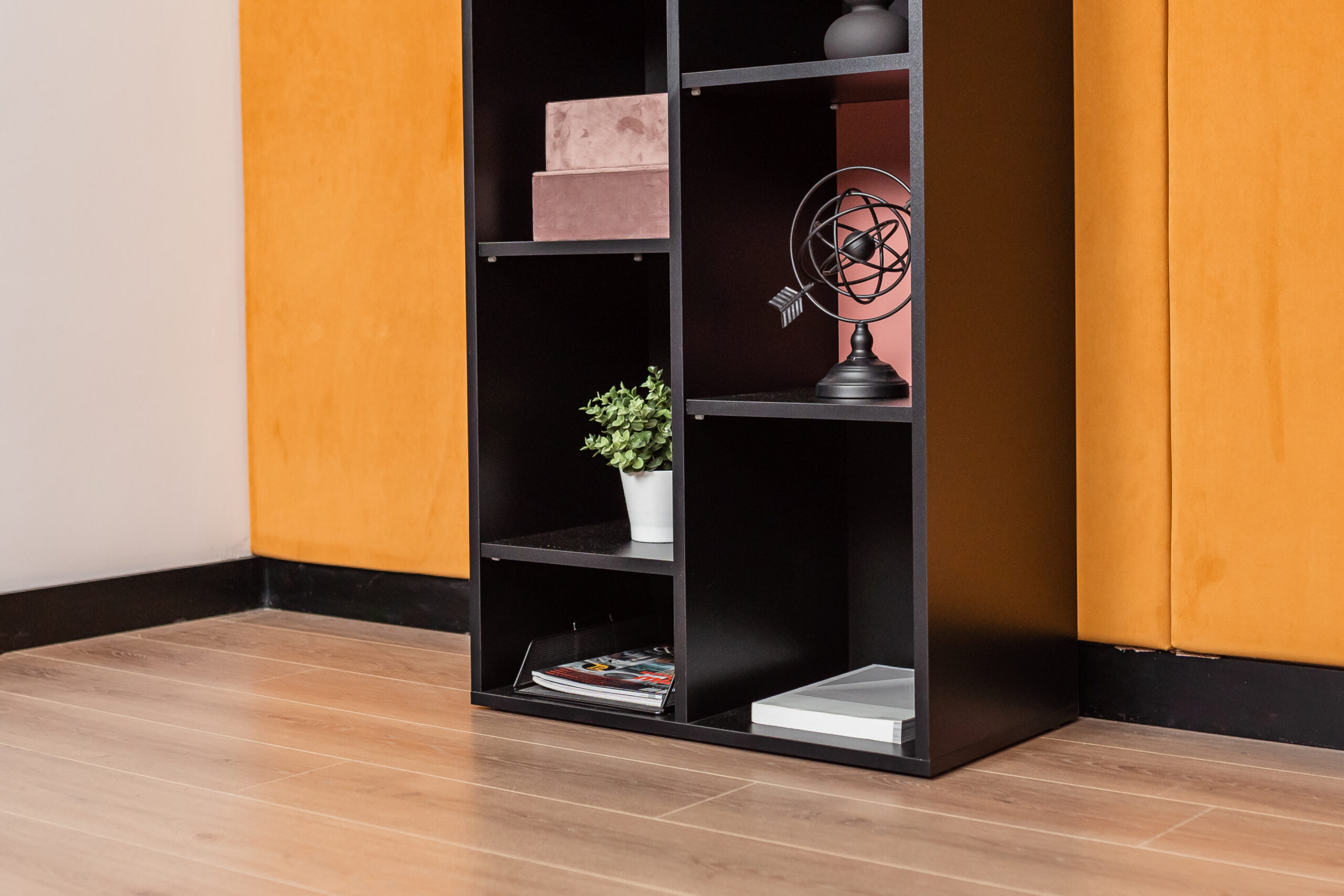 Black office bookcase with asymmetrically arranged shelves is a solution designed for storing documents in different formats. Varying the height of the compartments allows you to conveniently place both binders and folders, catalogs or filing boxes. This makes it easier to maintain order and adjust the space to the user’s actual needs.