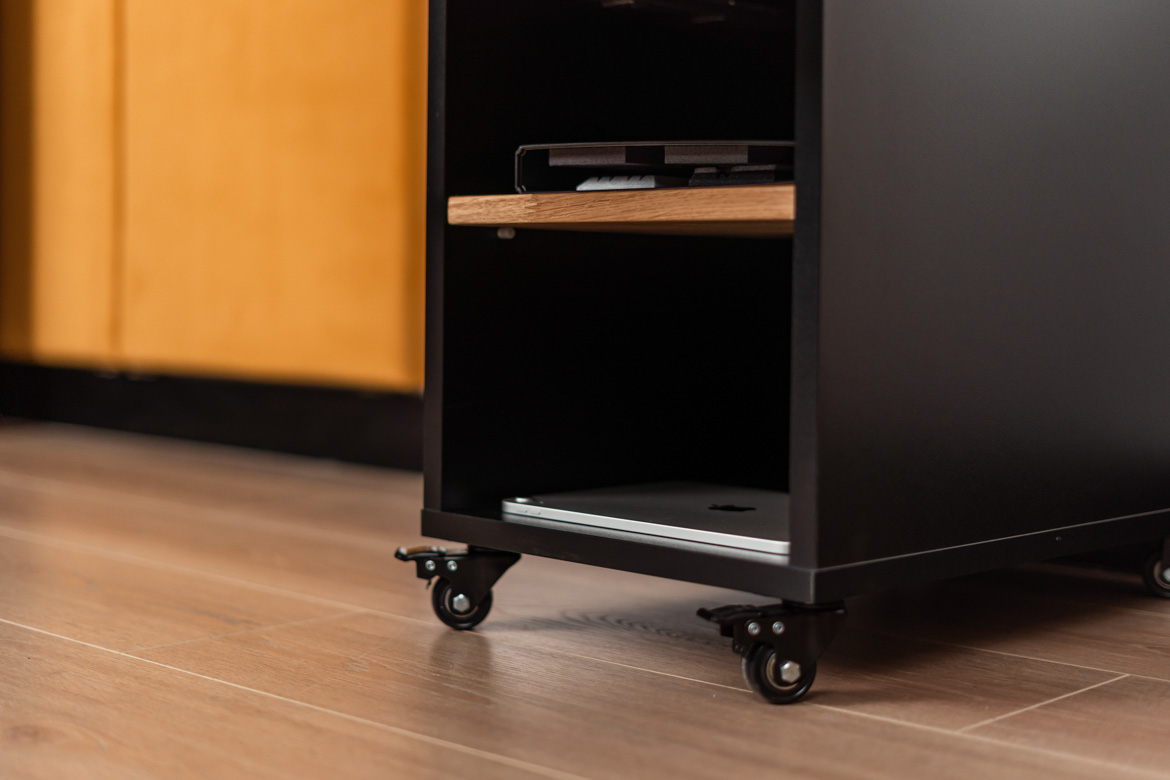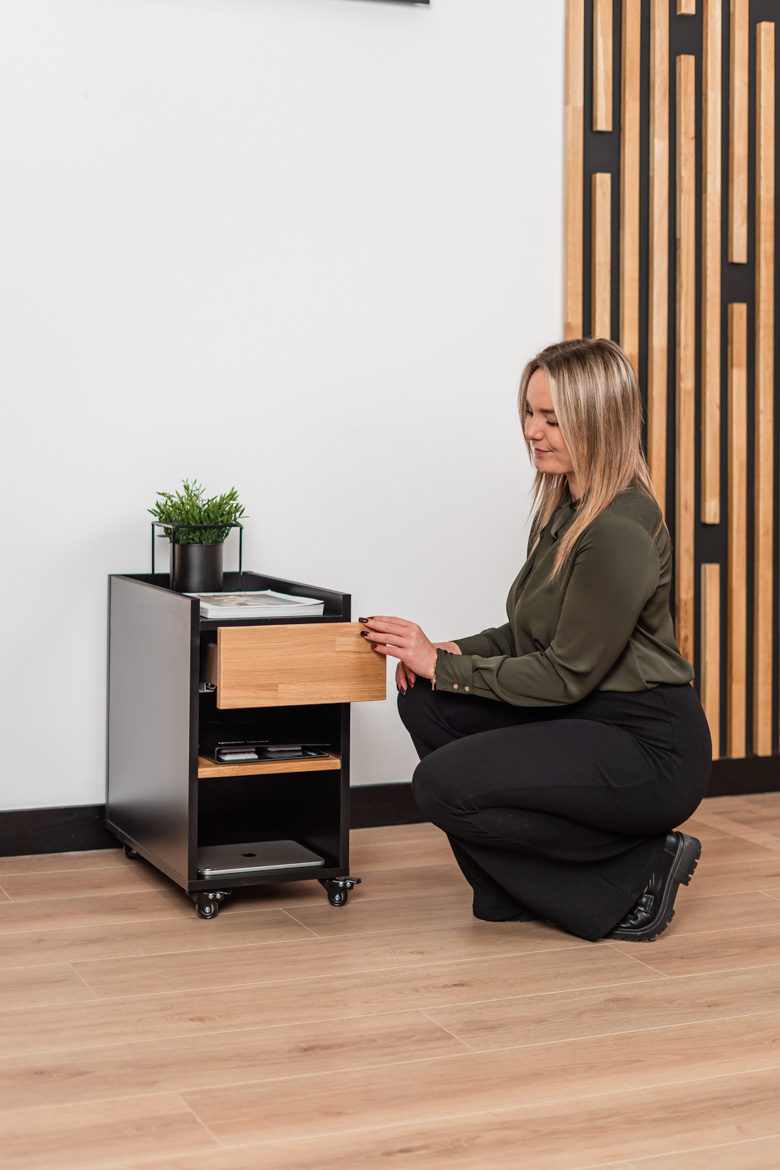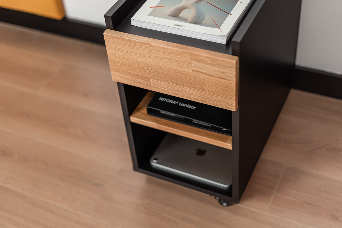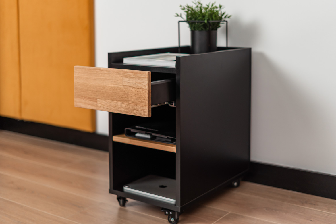 The combination of deep matte black with a natural shade of wood creates an exceptionally pleasant juxtaposition – modern, but with a touch of warmth. Thanks to this, the pedestal will fit perfectly into both an office space and a home workspace.