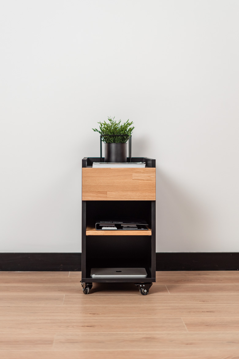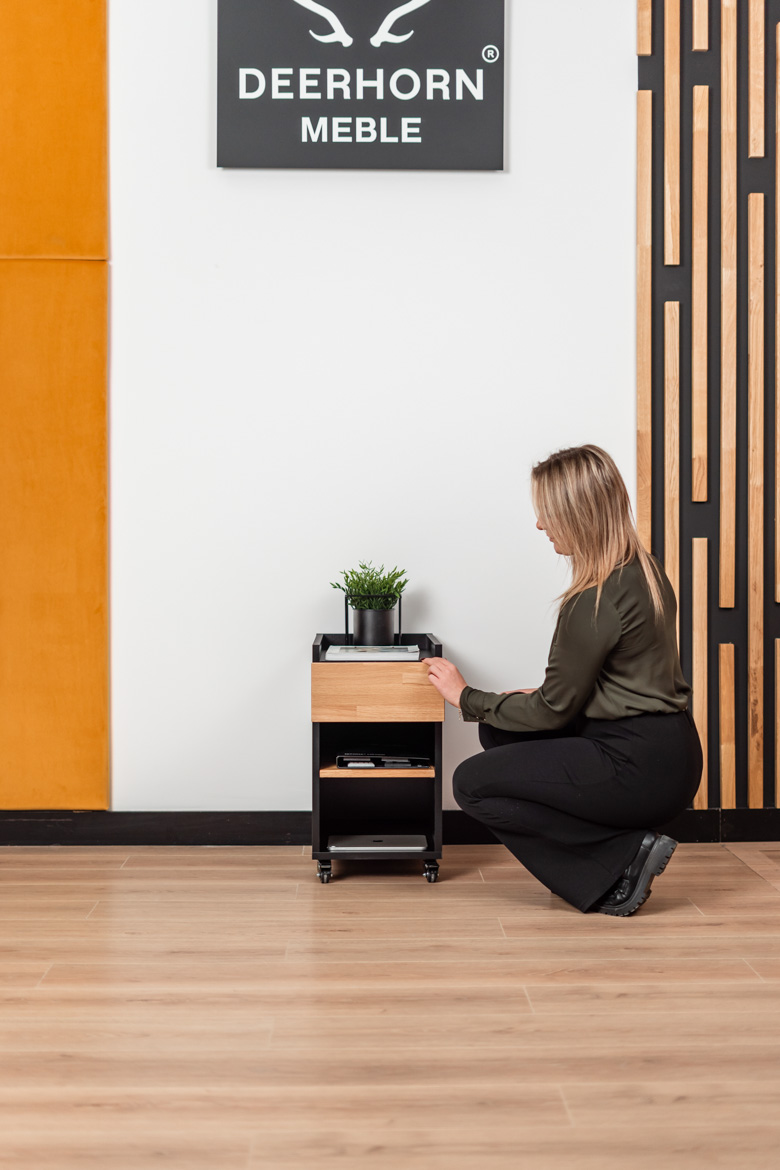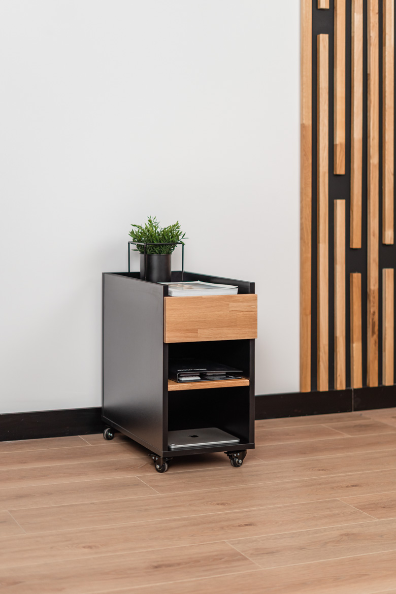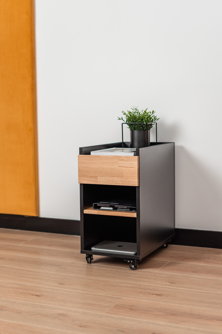 The combination of deep matte black with a natural shade of wood creates an exceptionally pleasant juxtaposition – modern, but with a touch of warmth. Thanks to this, the pedestal will fit perfectly into both an office space and a home workspace.