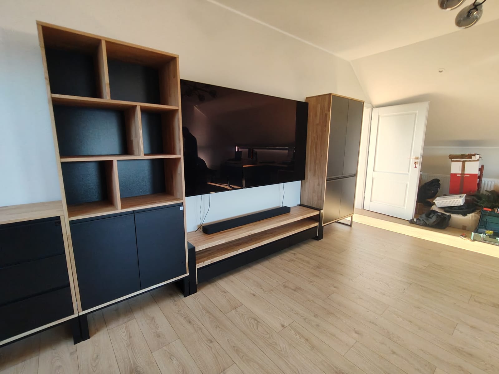 Industrial RTV cabinet is a unique piece of furniture that will create a cozy and warm atmosphere in your room. Solid oak, the shelves are able to support almost any weight, while looking lightweight. Loft furniture blends perfectly into any room.