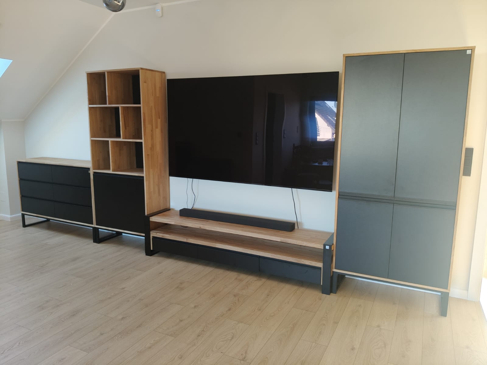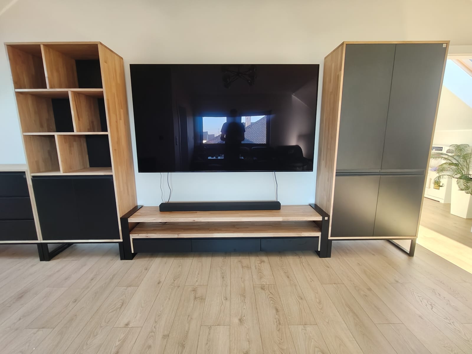 Minimalist, fashionable RTV cabinet made of wood and metal.