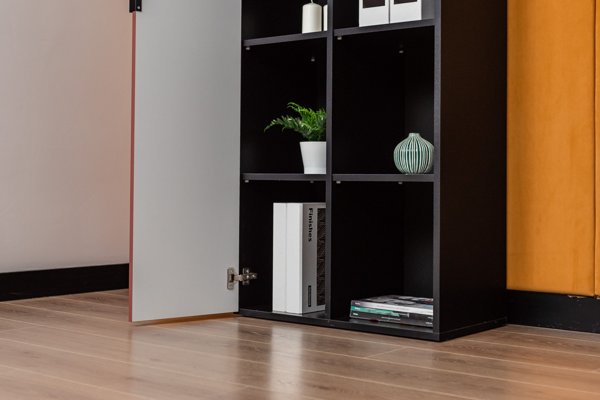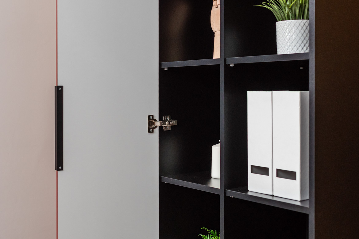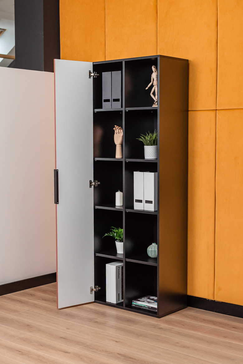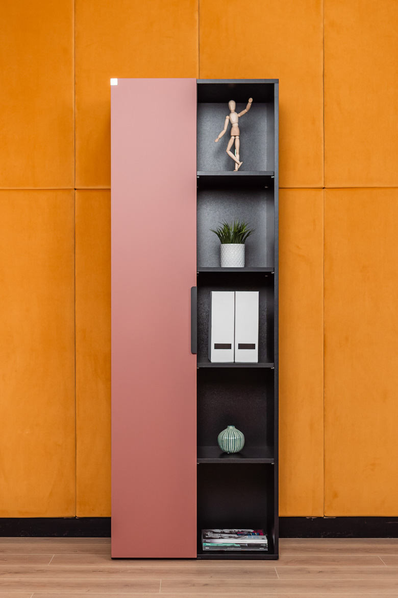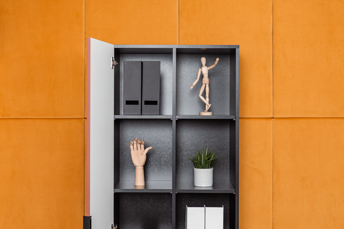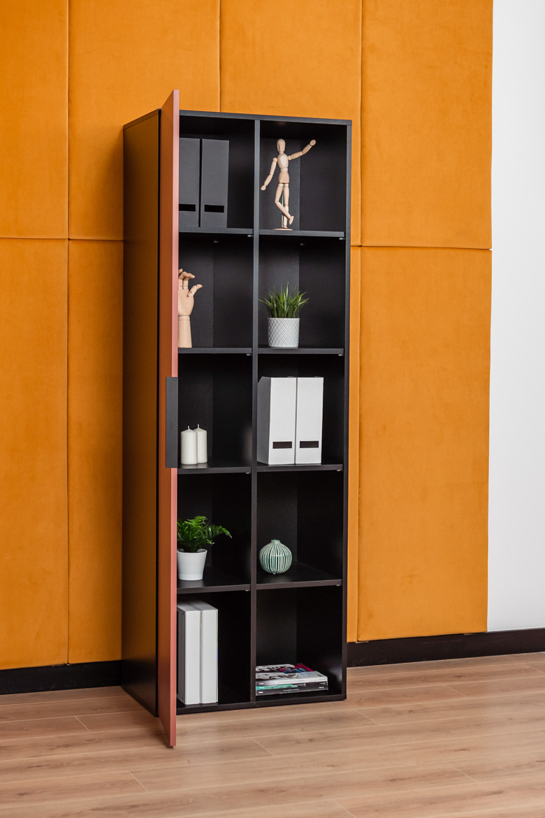 What if one piece of furniture could serve several functions at once – store what you need, hide what you don’t need, and at the same time display what you want to surround yourself with? This elegant bookcase does just that – on one side – open shelves for books, documents or decorations, on the other – an enclosed space hidden behind a brick-toned front.