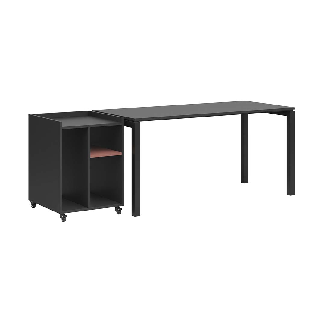The set consists of a classic desk and a separate cabinet on wheels, the height of which matches the tabletop. It can be placed right next to it, creating an extension of the work surface – an ideal place for a computer, printer or additional materials.