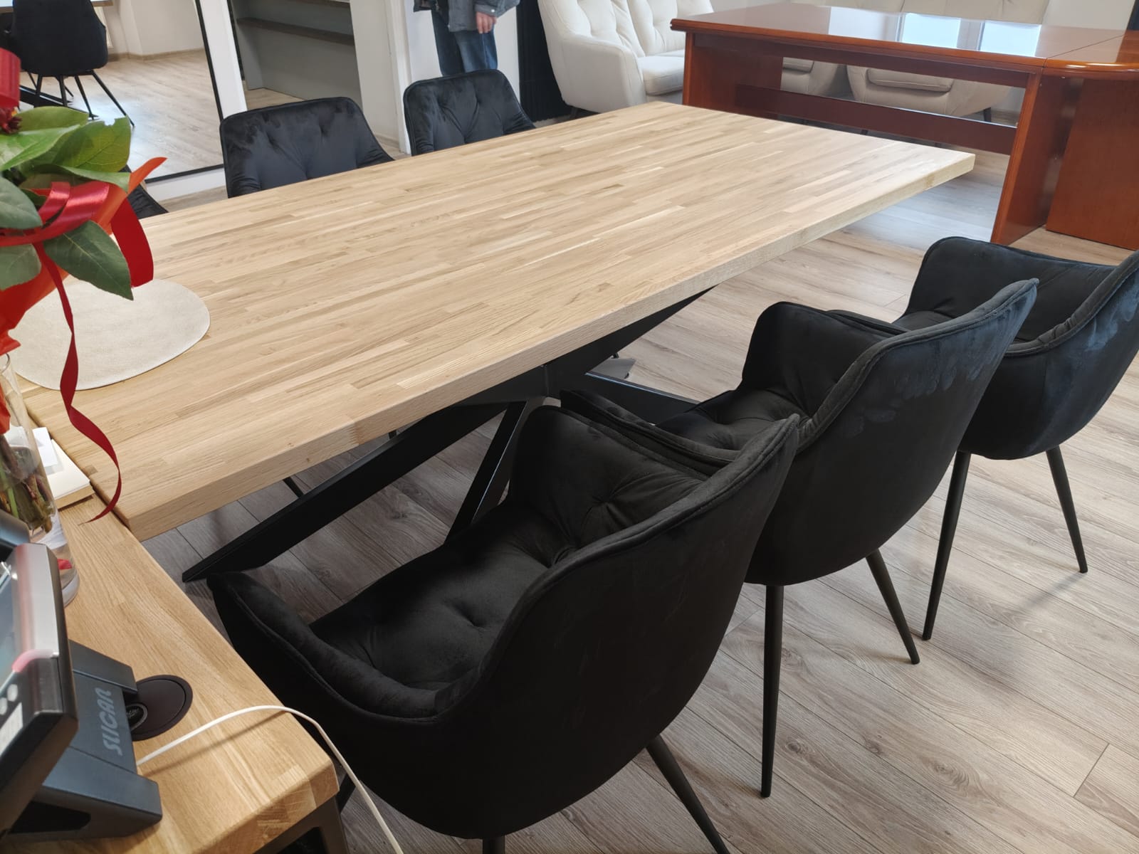 This table immediately catches the eye—it looks sturdy and very substantial. The spider-leg design allows for plenty of flexibility when arranging chairs, and the tabletop itself is impressively large. Everything is solid, well-finished, and you can tell it’s a piece of furniture built to last. A great choice for a large space.