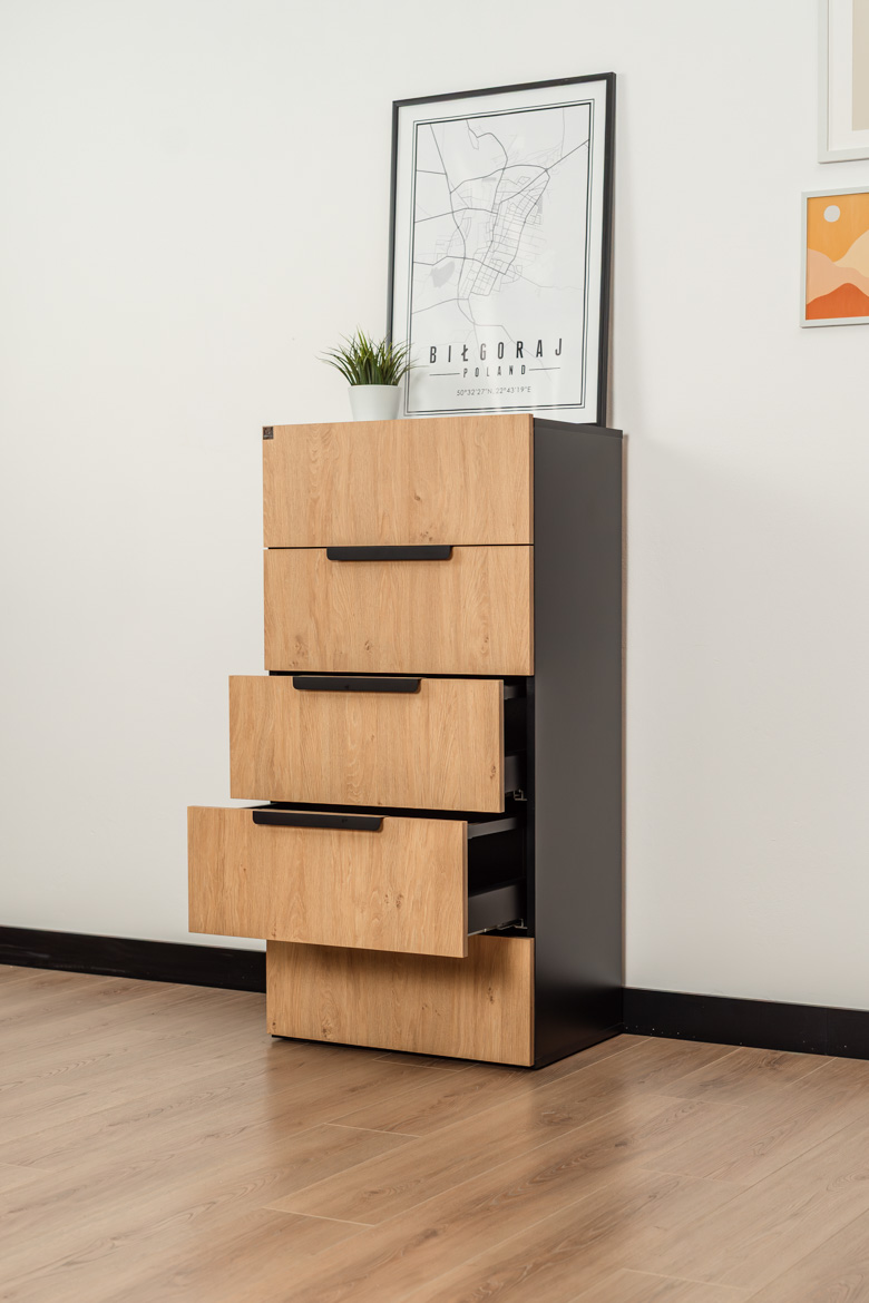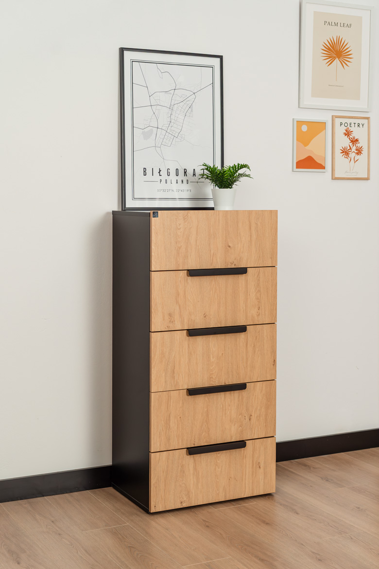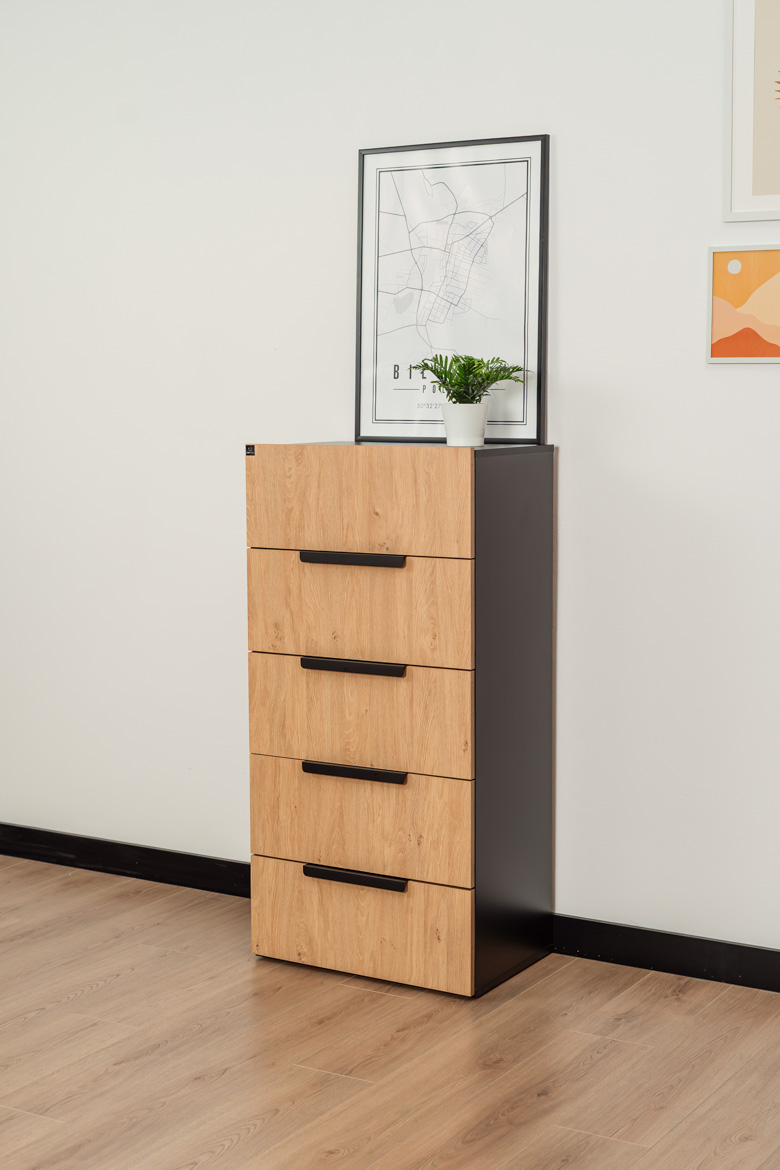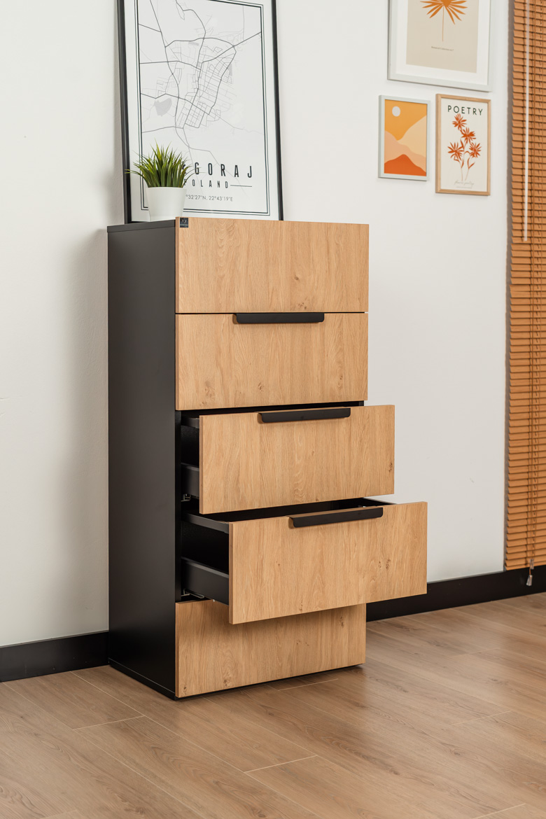 Tall office filing cabinet with 5 drawers is a practical and aesthetically pleasing piece of furniture designed for modern office spaces. Thanks to the elegant combination of oak color and black finishes, it fits perfectly with both loft-type and minimalist decor.