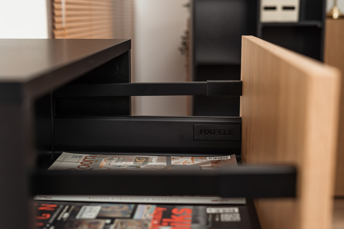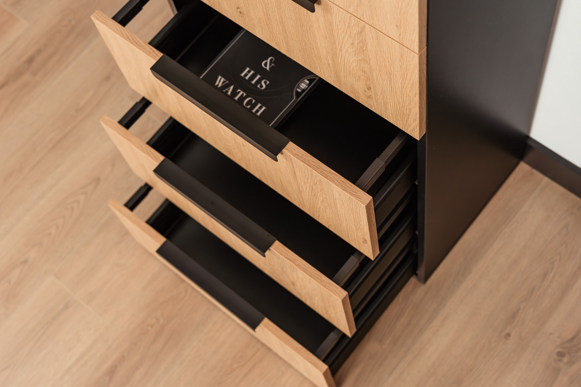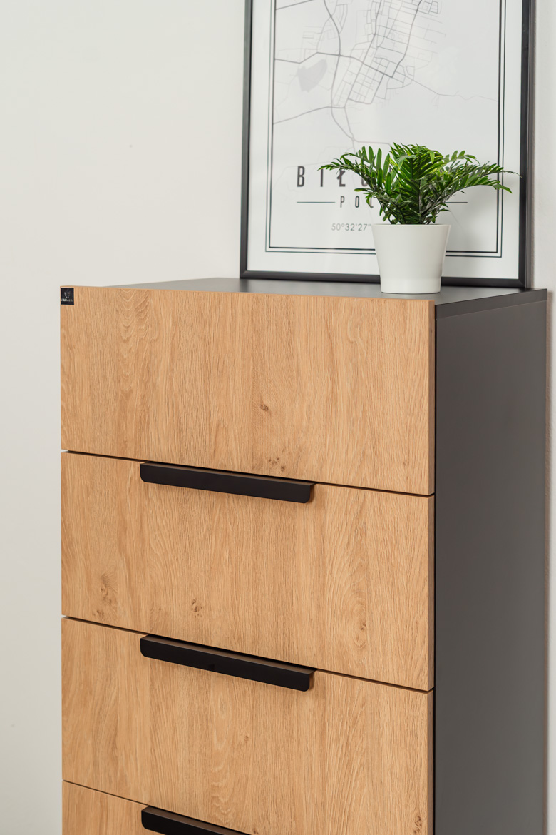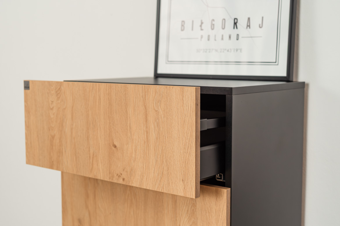 Tall office filing cabinet with 5 drawers is a practical and aesthetically pleasing piece of furniture designed for modern office spaces. Thanks to the elegant combination of oak color and black finishes, it fits perfectly with both loft-type and minimalist decor.