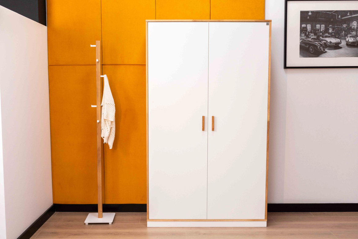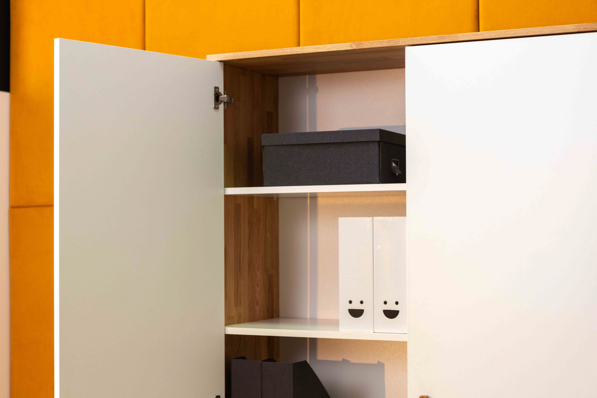 White cabinet with wooden body. Modern design that will fit perfectly into your home or office.