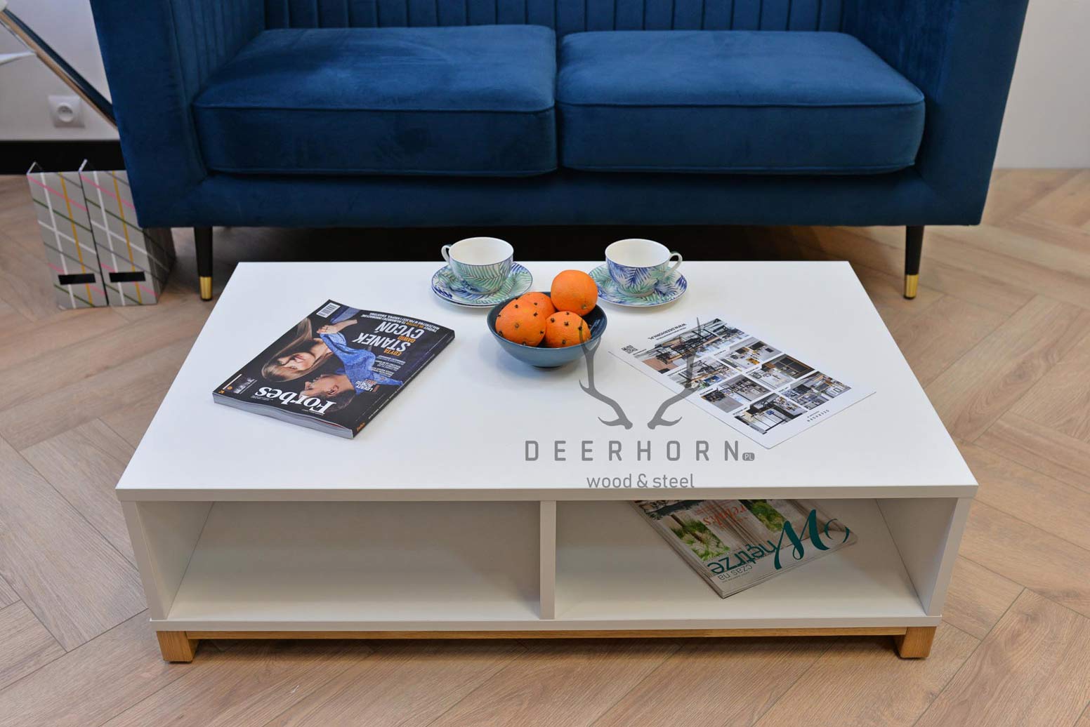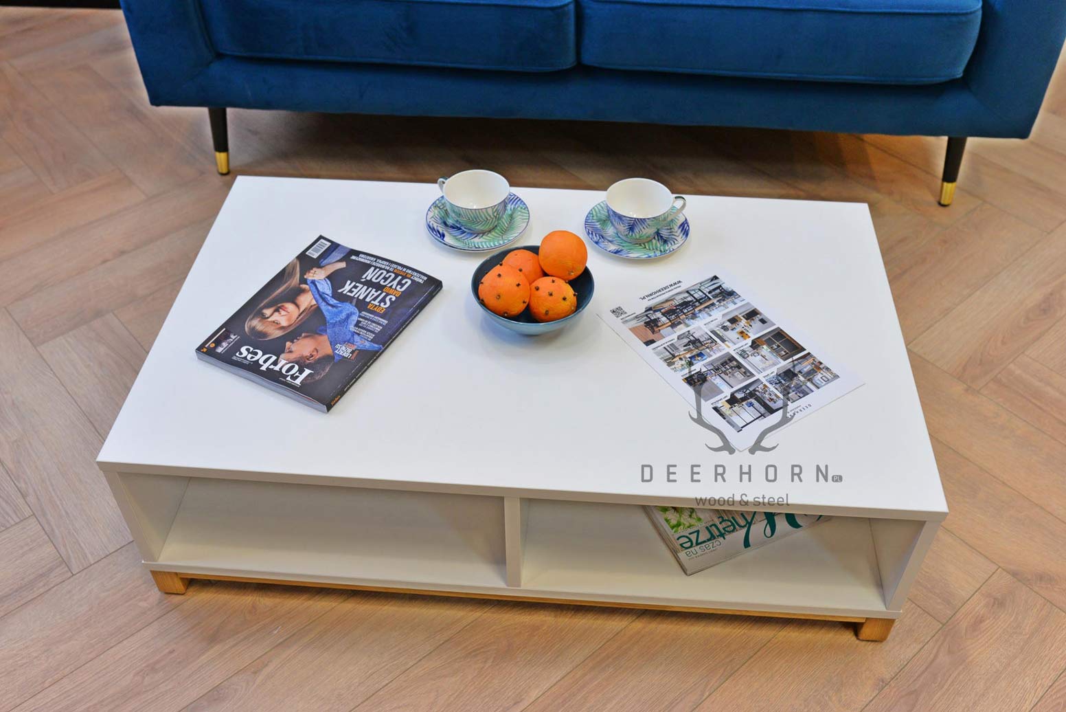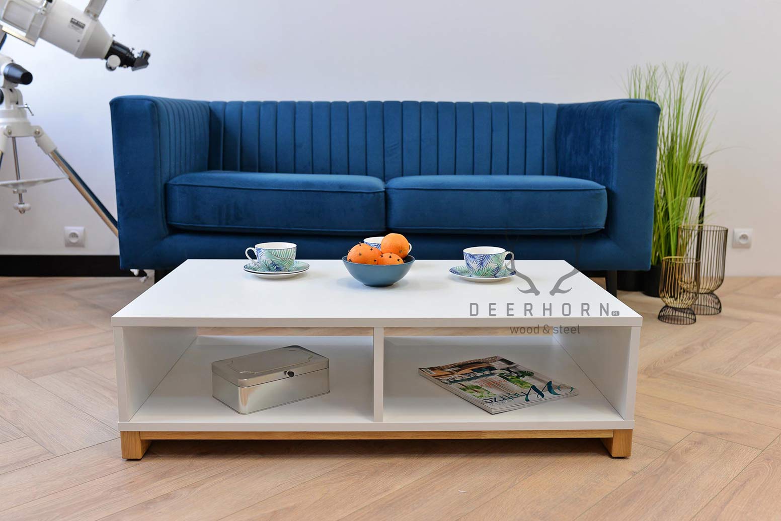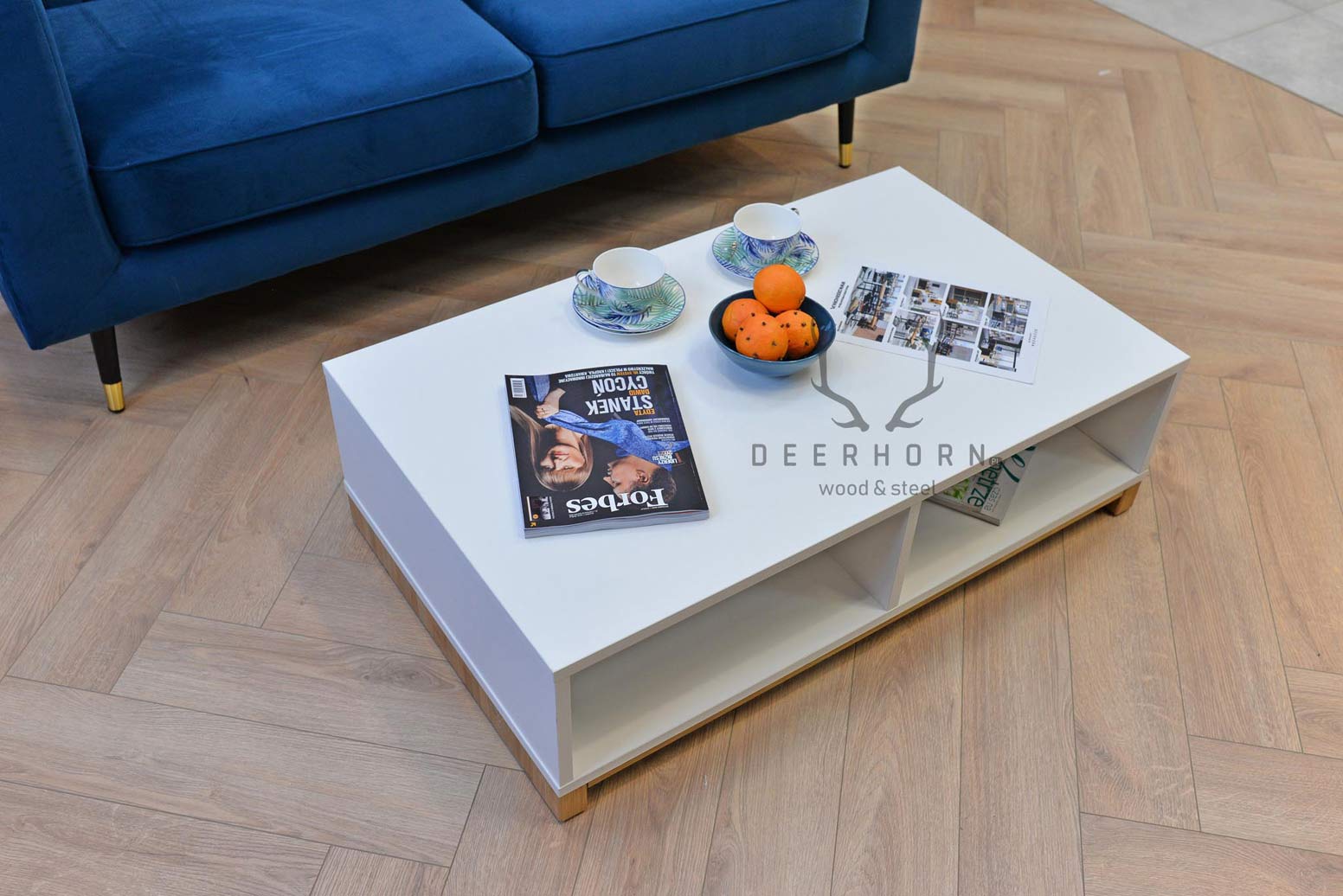 Coffee table with wooden base is dedicated to modern rooms. The combination of wood and white furniture board gives a unique charm. The duo they form together arouses admiration and positively influences the quality of work. The coffee table with shelves has two sections where you can put newspapers, books and other small items.