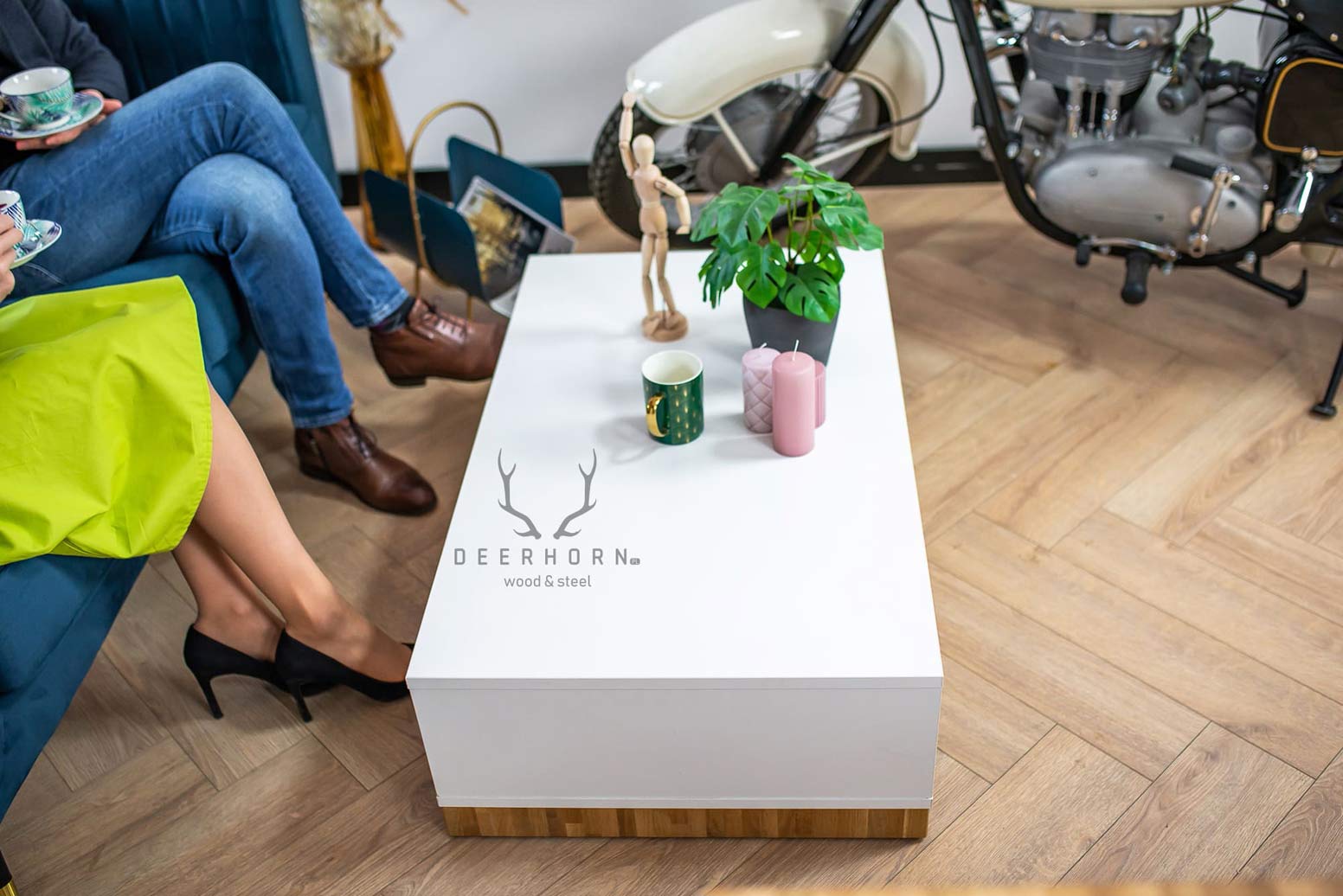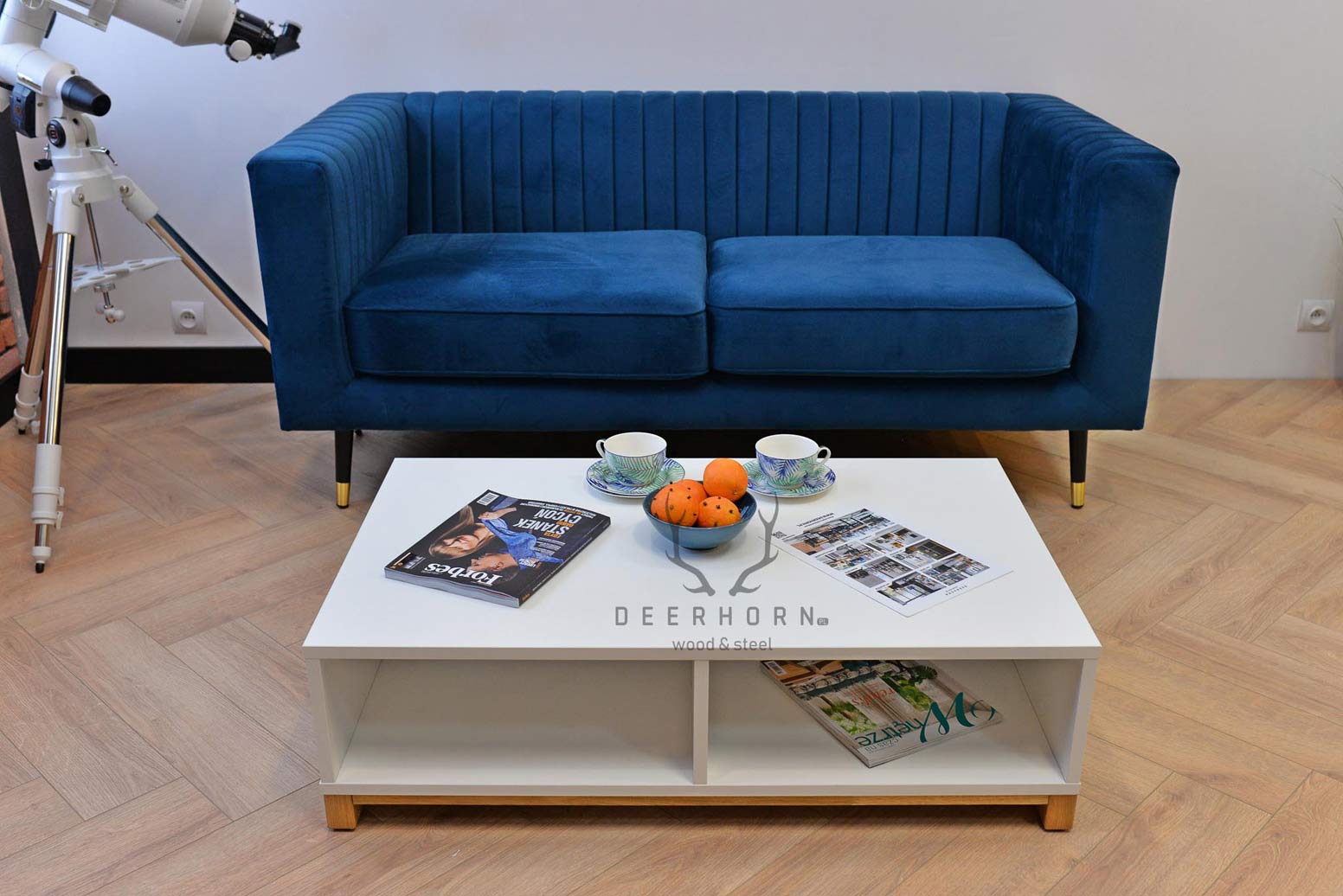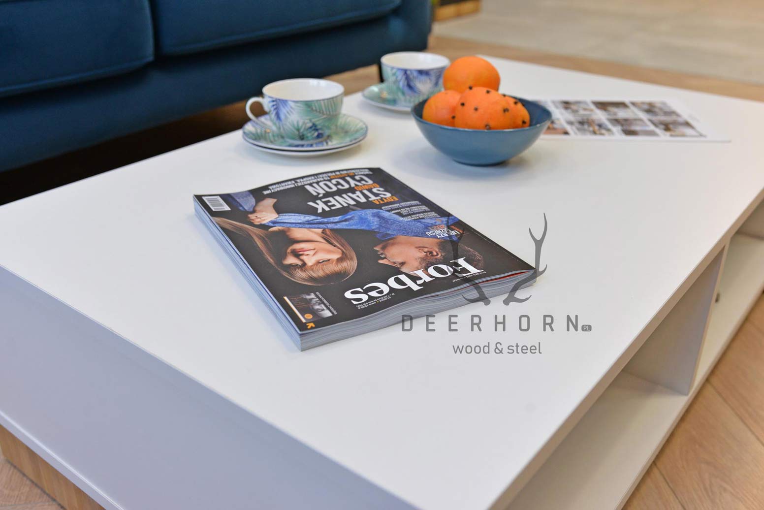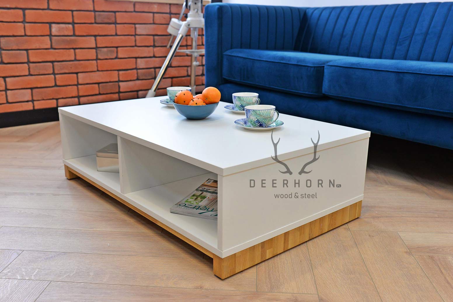 Coffee table with wooden base is dedicated to modern rooms. The combination of wood and white furniture board gives a unique charm. The duo they form together arouses admiration and positively influences the quality of work. The coffee table with shelves has two sections where you can put newspapers, books and other small items.