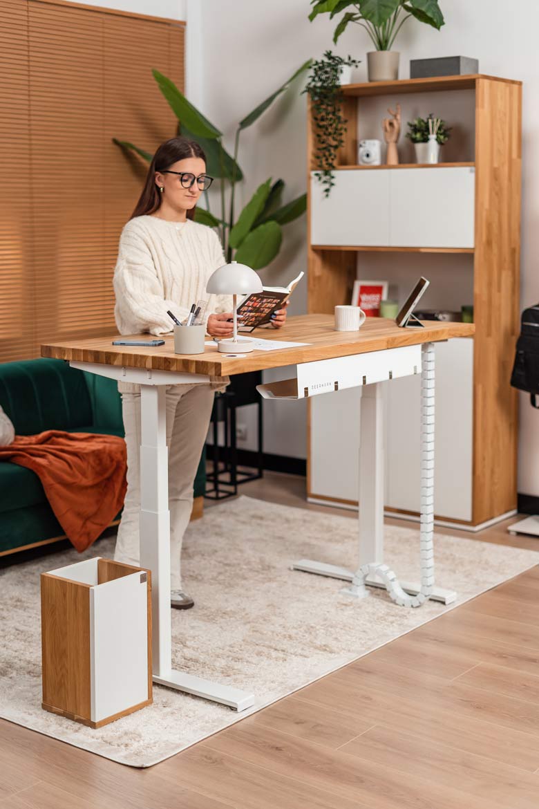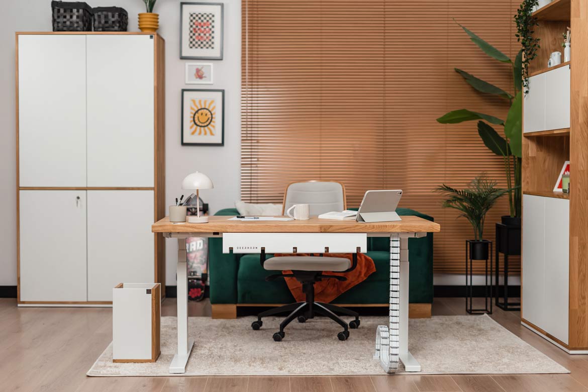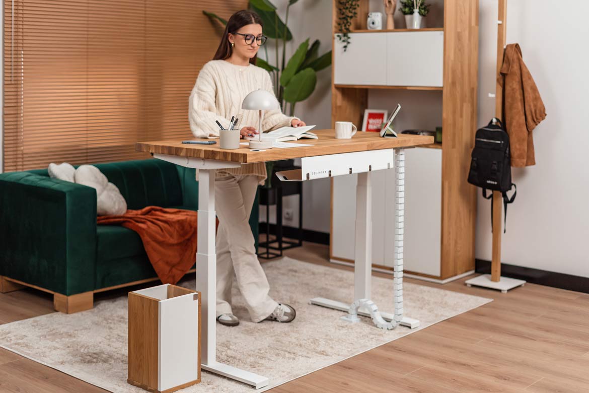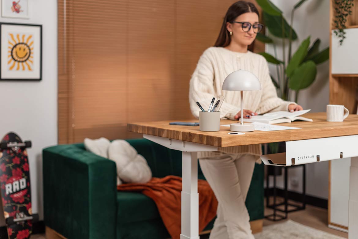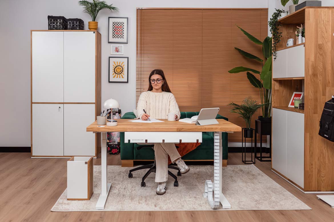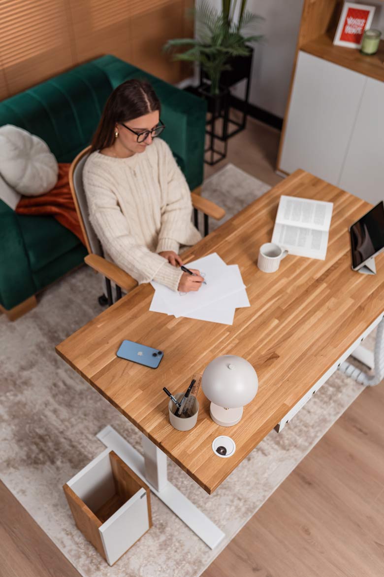 Biurko z regulacją wysokości to jeden z najlepszych zakupów do mojego domowego biura. W połączeniu z naturalnym drewnem prezentuje się naprawdę świetnie.