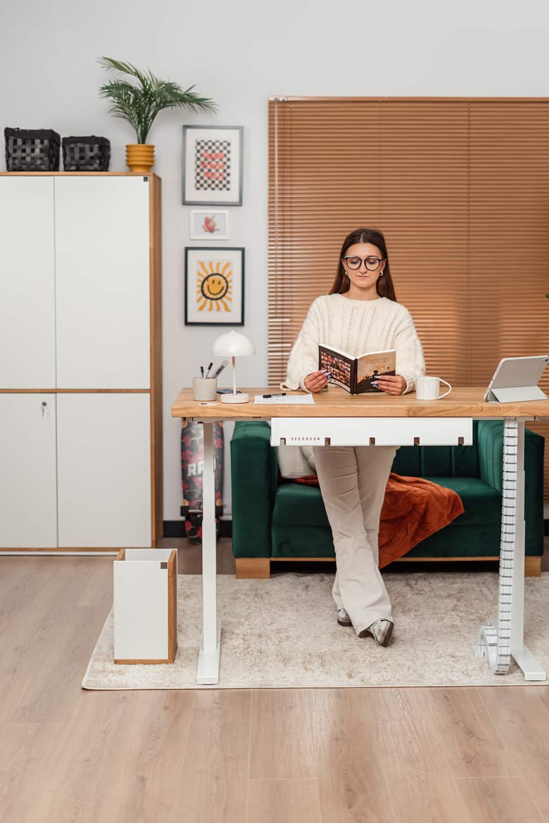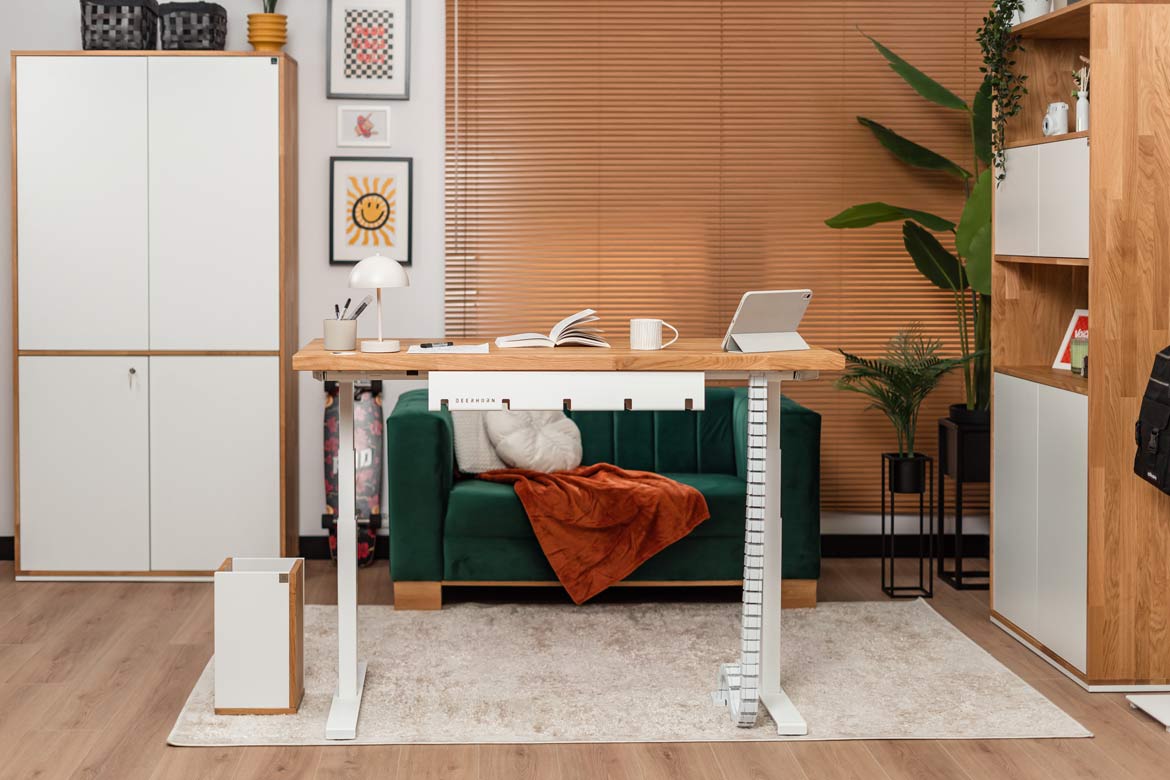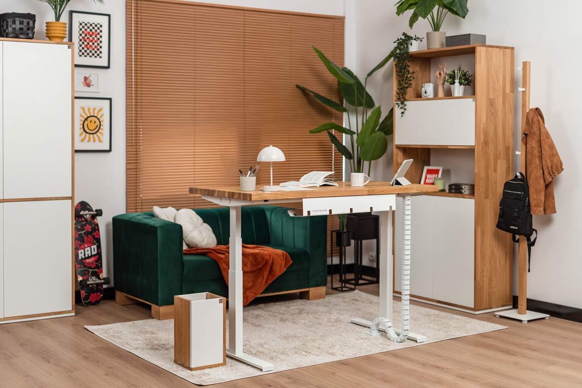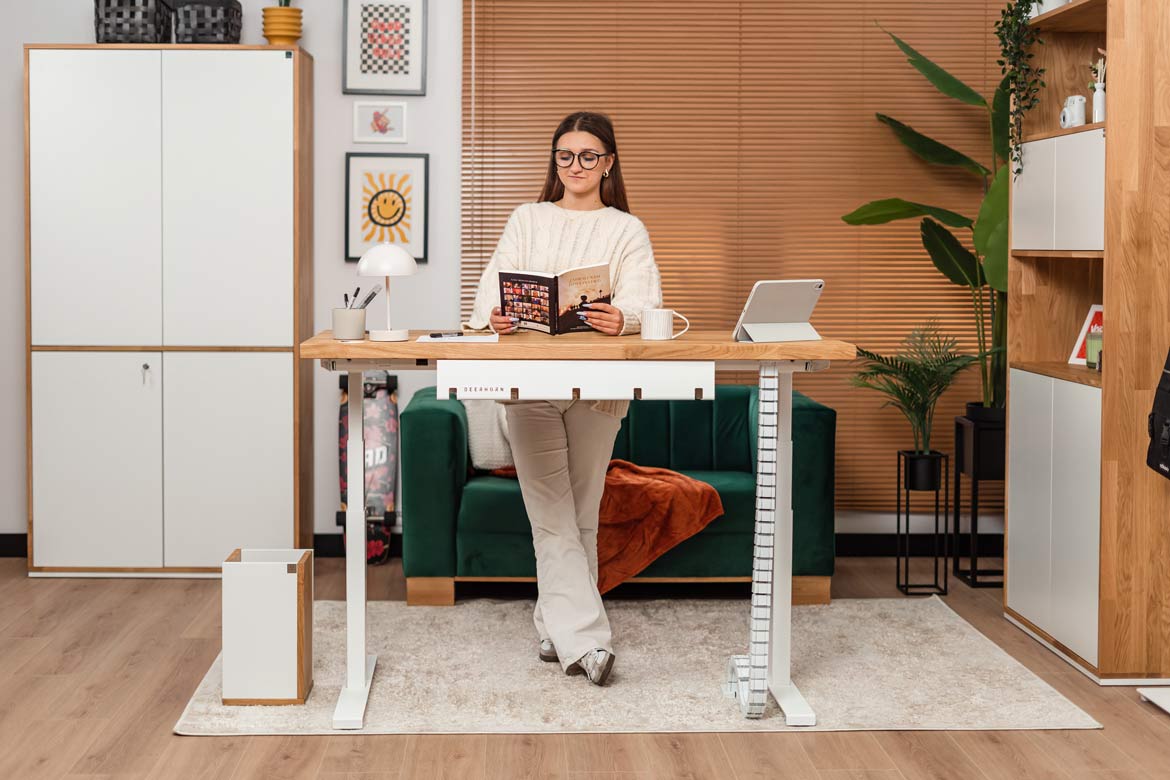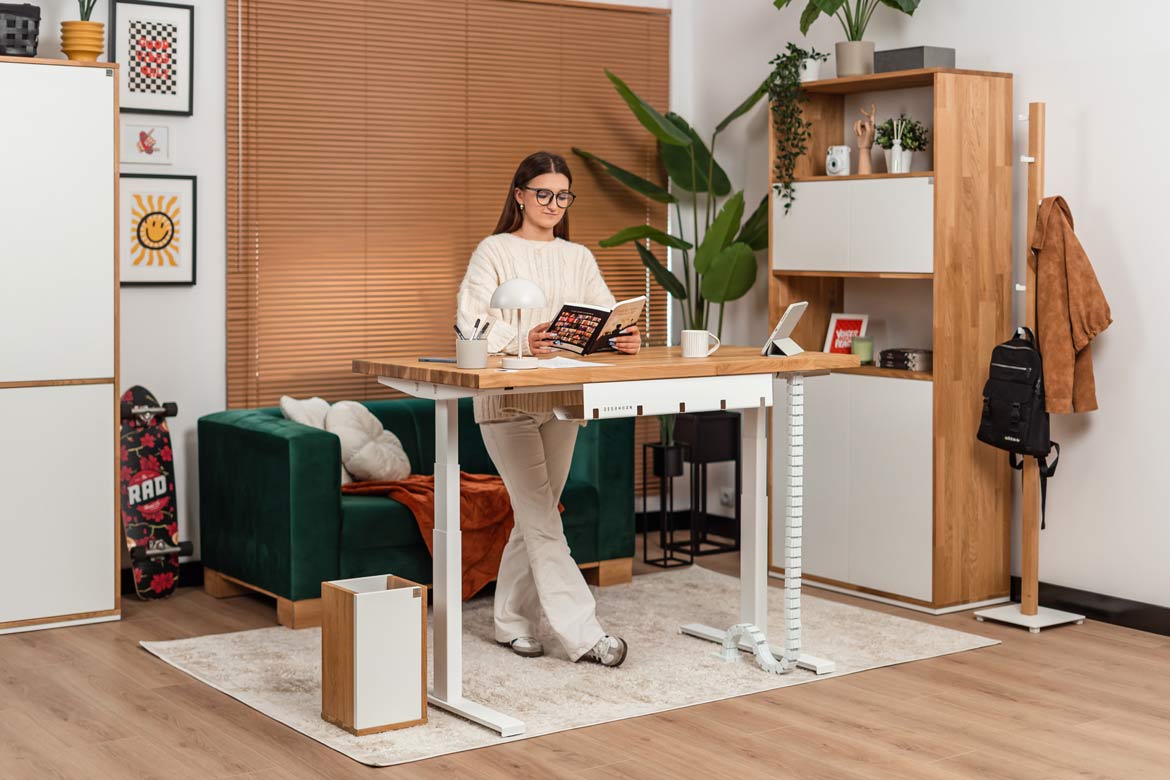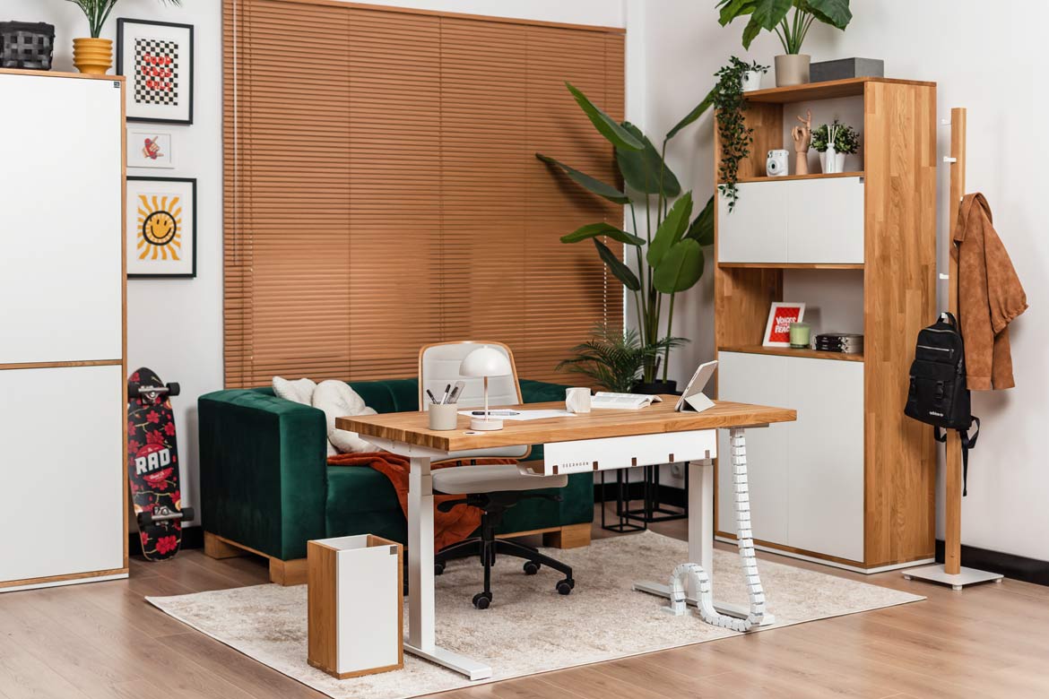 Biurko z regulacją wysokości to jeden z najlepszych zakupów do mojego domowego biura. W połączeniu z naturalnym drewnem prezentuje się naprawdę świetnie.