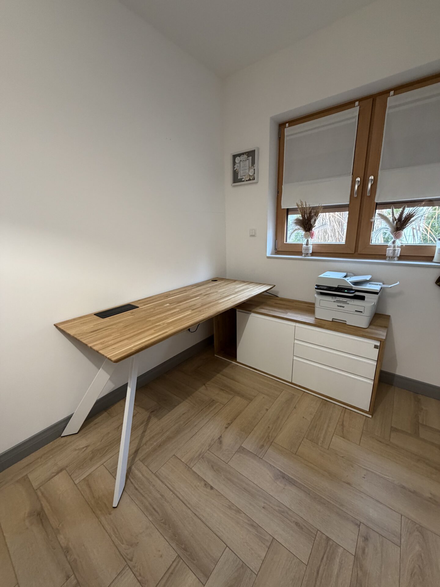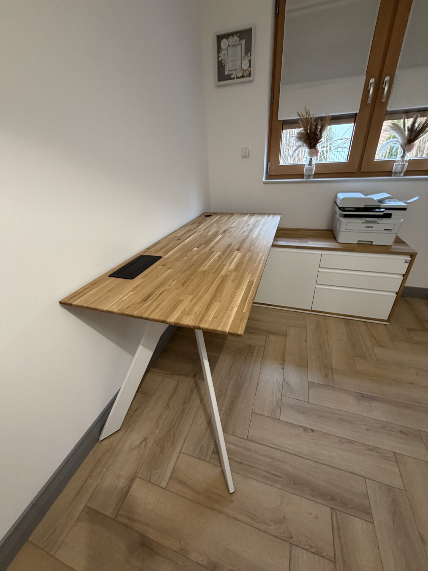 Białe, dębowe biurko narożne wygląda bardzo elegancko. Jasna kolorystyka rozjaśnia wnętrze, a dębowy blat dodaje solidności i stylu. Dużo miejsca do pracy i świetne wykorzystanie narożnika. Polecam.