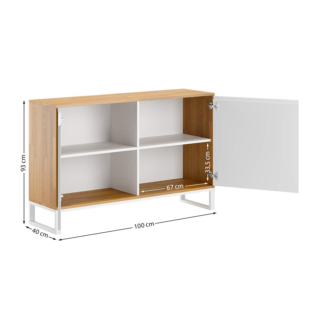 This white two-door dresser with oak wood elements is the perfect combination of modern style and natural elegance. Its minimalist design brings lightness and harmony to the interior, while the oak accents add warmth and character. The spacious interior behind the double doors provides plenty of storage space, helping to keep your office, living room, bedroom in order. Solid workmanship and top-quality materials guarantee durability that will stand up to everyday needs. This chest of drawers is not only a practical piece of furniture, but also a stylish addition to any interior.