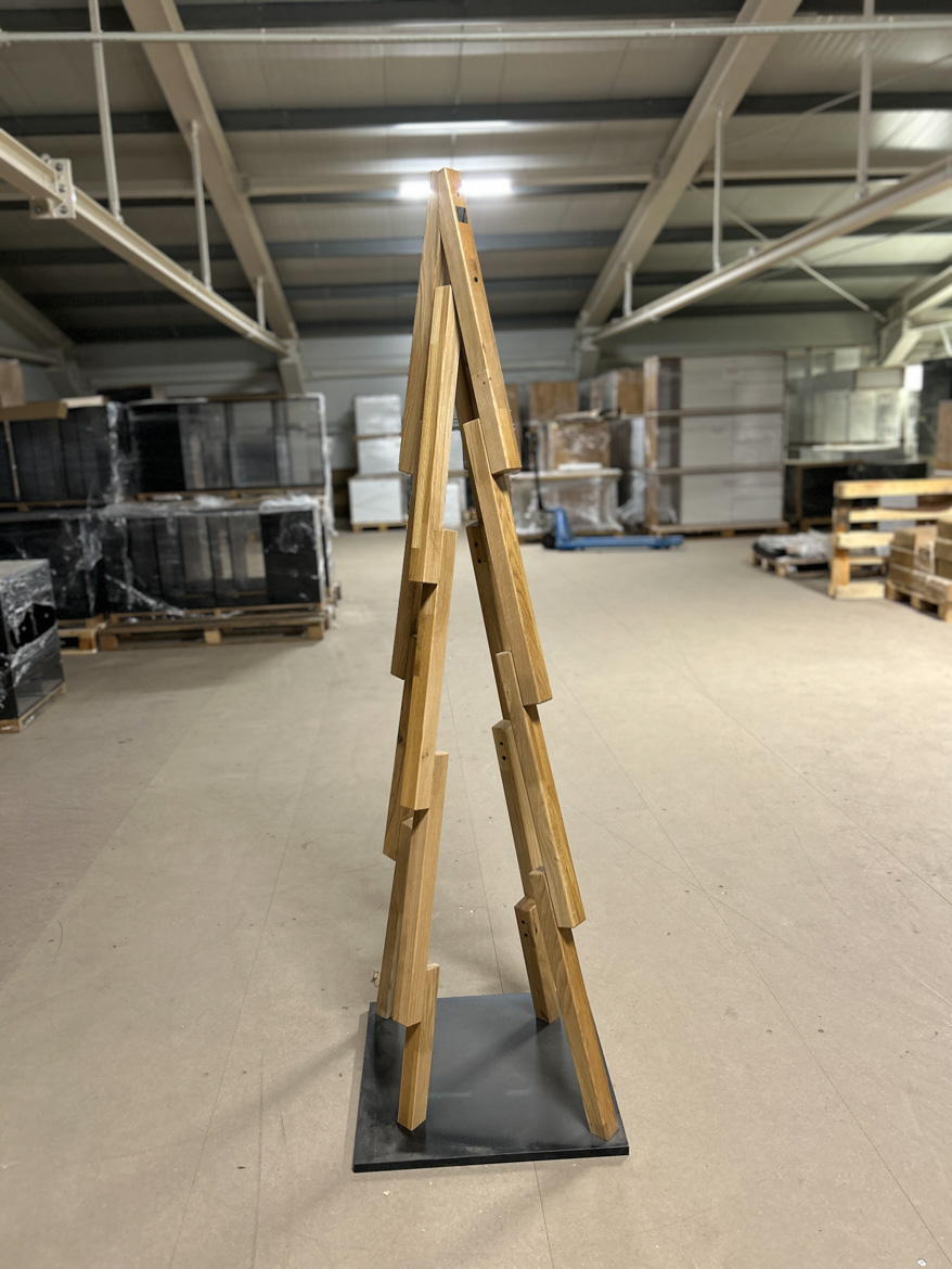 Modern, minimalist Christmas tree made of natural wood. The structure consists of vertical, stepped slats that form a geometric form resembling a Christmas tree. The base provides a secure setting. Ideal as a decoration for home, office, storefront or commercial space. Great for loft, Scandinavian and industrial styles.