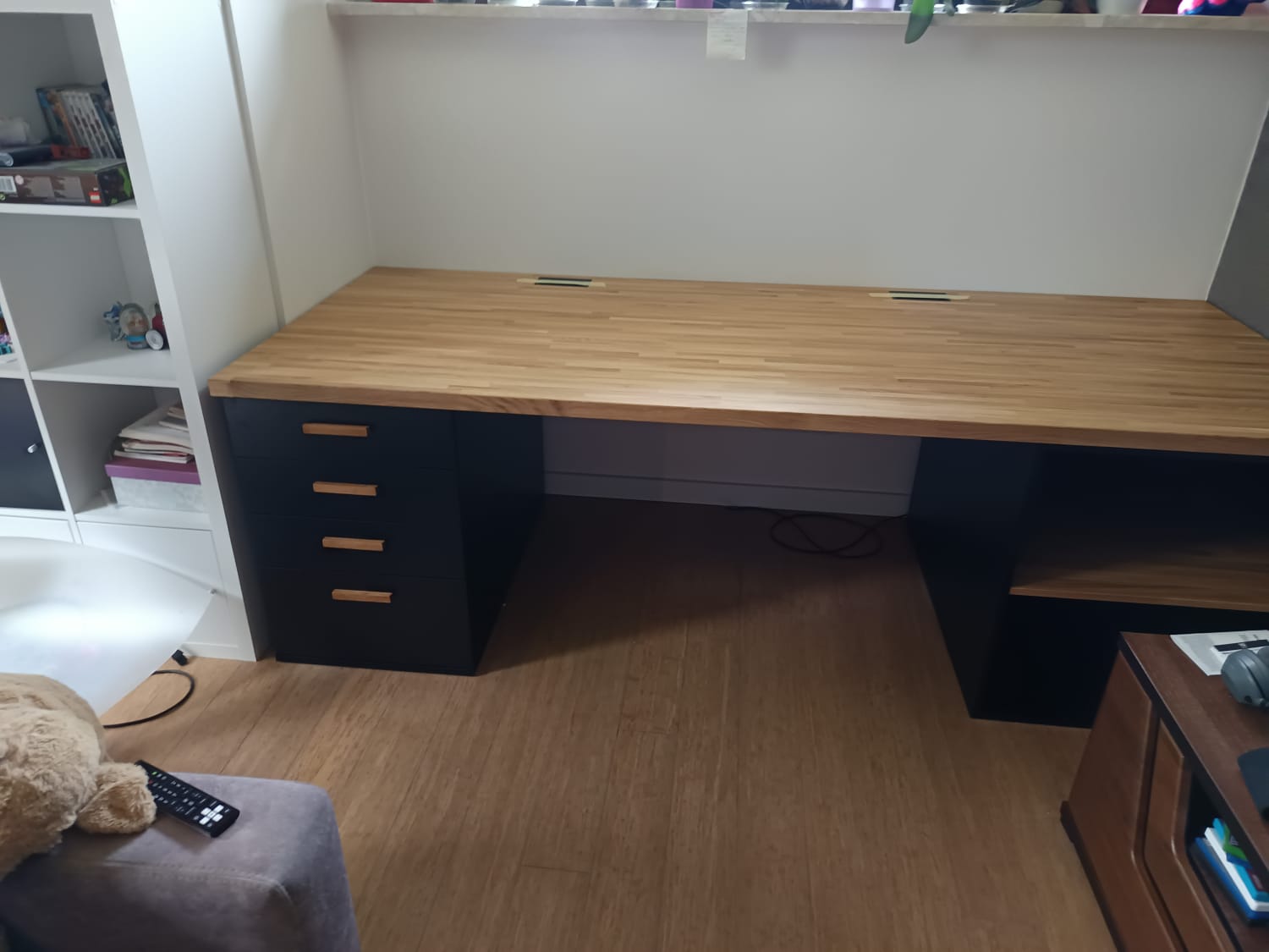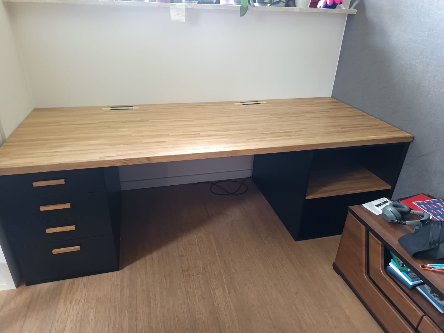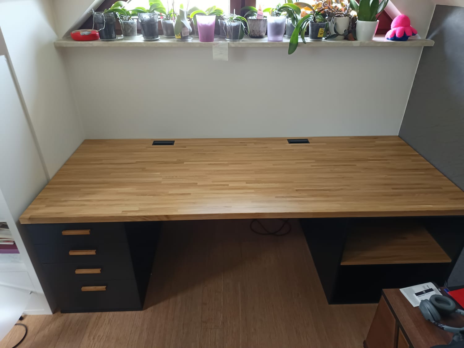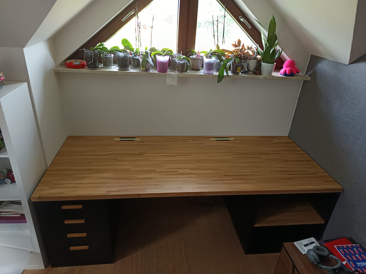 So we designed a wide, sturdy desk with an oak top, perfectly matching the alcove under the window. On the left side we added a pedestal with four drawers, and on the right a practical open shelf. The whole thing is stable, functional and looks really elegant in this cozy attic corner.