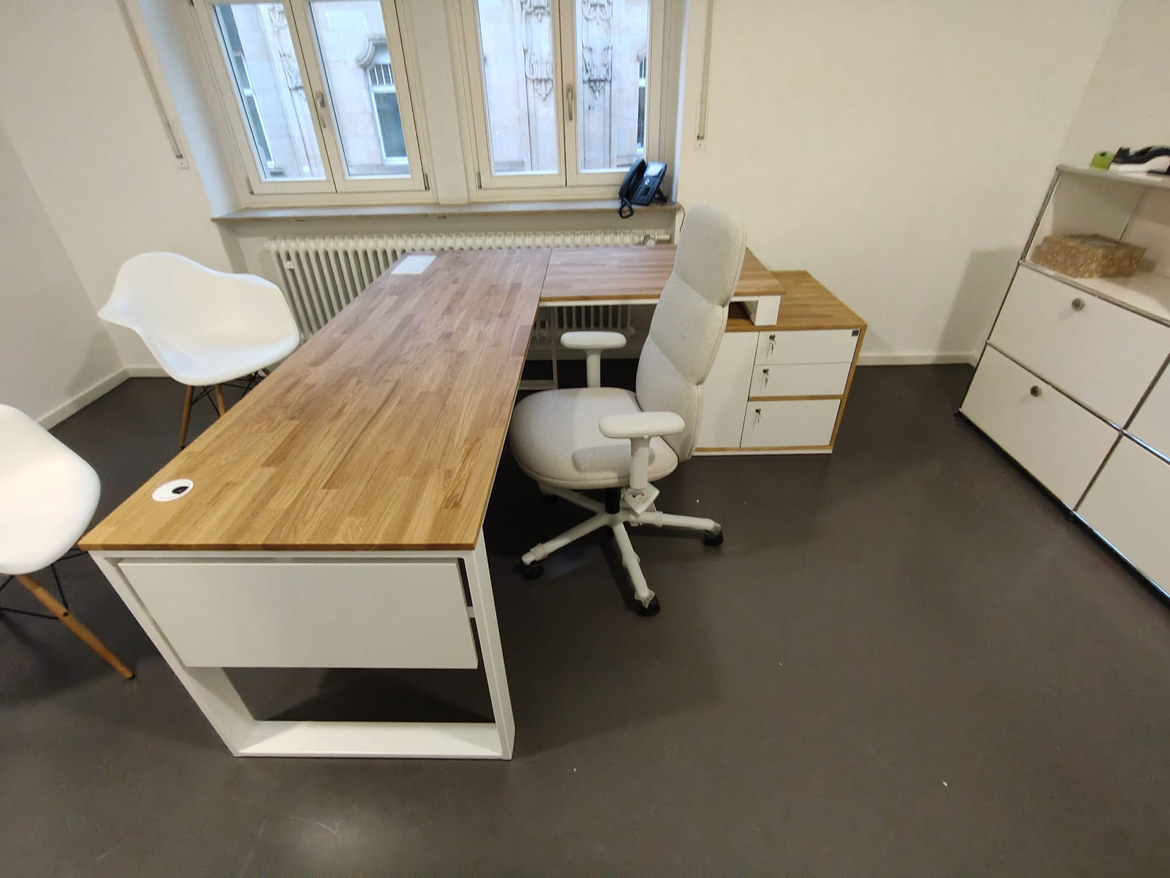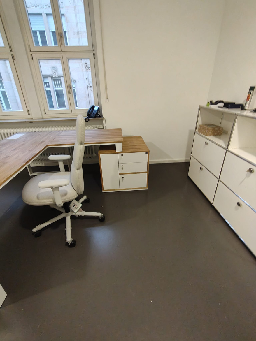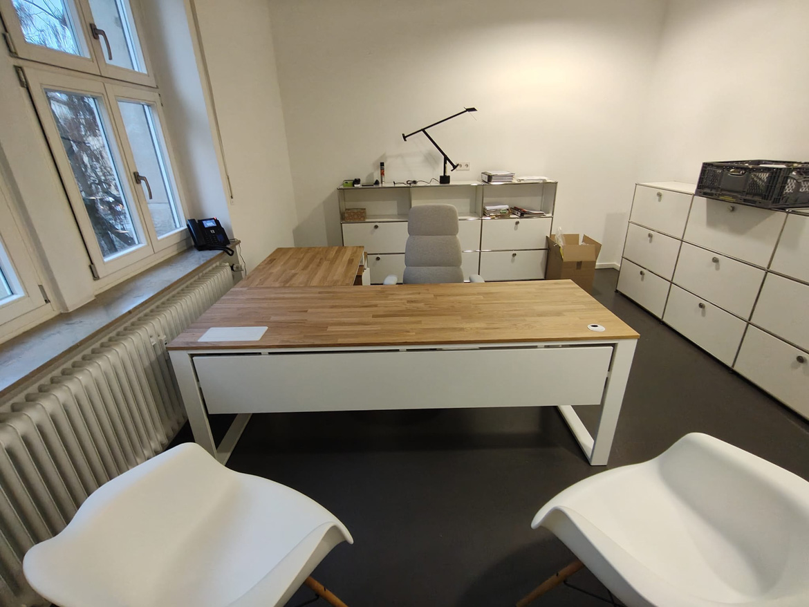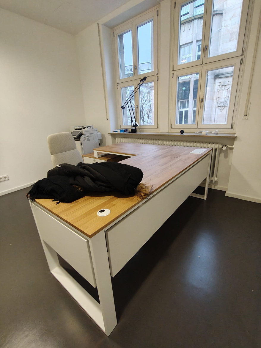 For Psychiatrische Gutachtenpraxis Stuttgart, we realized a corner office desk designed for daily, quiet work in a medical space. The form of the furniture was tailored to the layout of the room, so as to maximize the use of available space and at the same time maintain order and comfort.