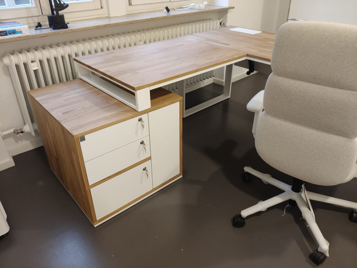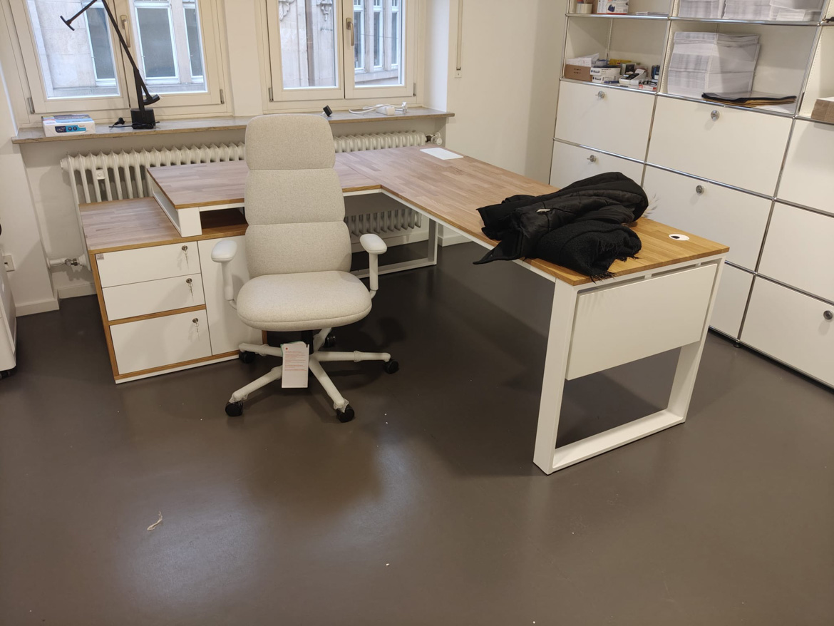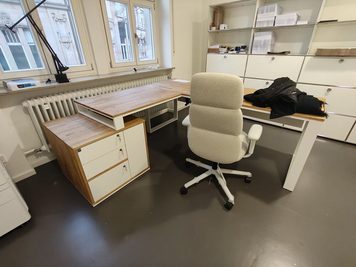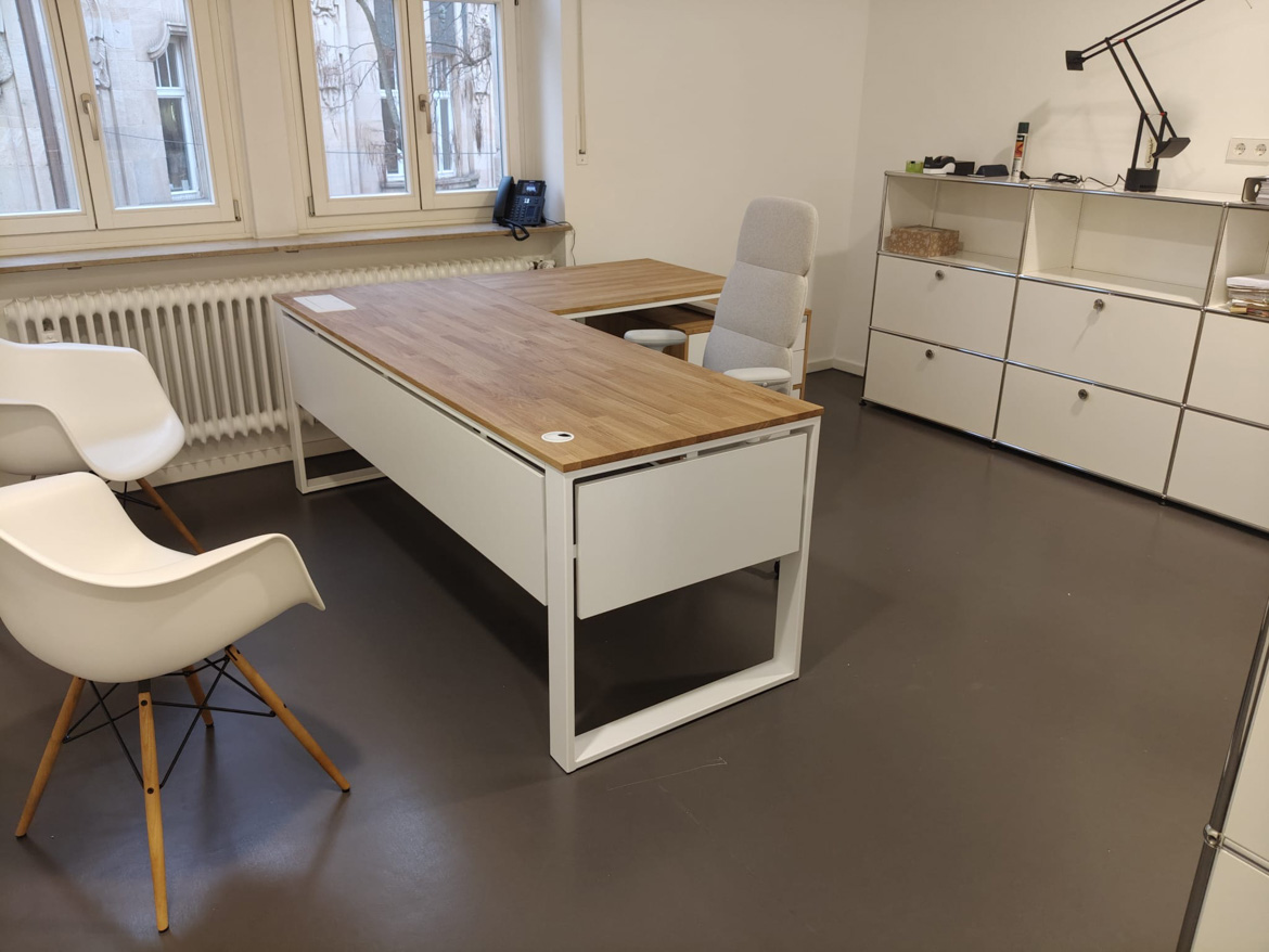 For Psychiatrische Gutachtenpraxis Stuttgart, we realized a corner office desk designed for daily, quiet work in a medical space. The form of the furniture was tailored to the layout of the room, so as to maximize the use of available space and at the same time maintain order and comfort.