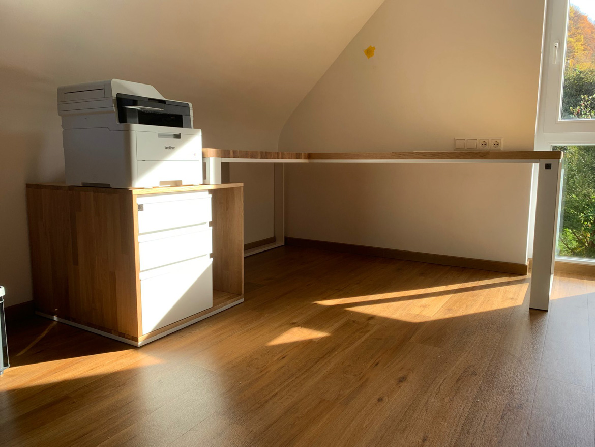 The combination of warm wood and white makes the whole look light and modern. This is an ideal solution for home office – practical, comfortable and simply pleasant for everyday use.