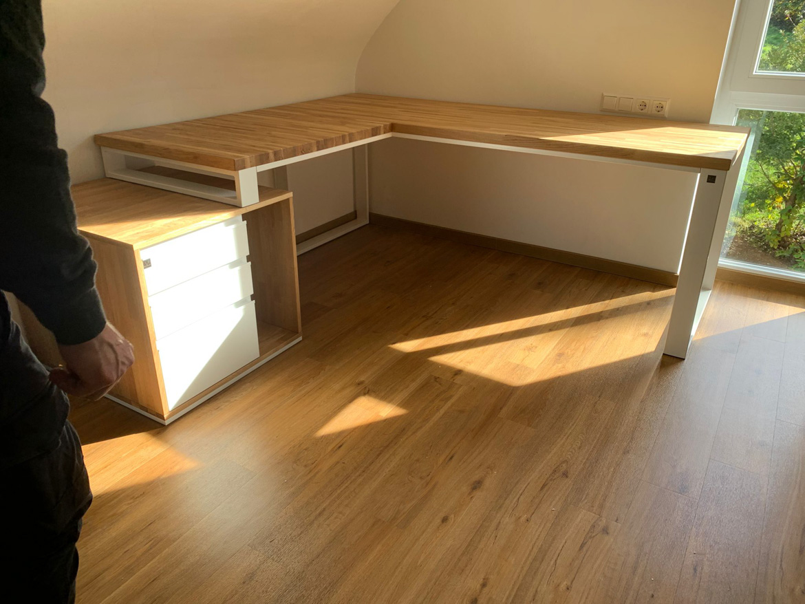 We made a corner desk with a pedestal for our client from Germany, designed for comfortable work at home. The large top gives plenty of space for a computer, documents and other necessary things, and the pedestal with drawers helps to keep things in order.